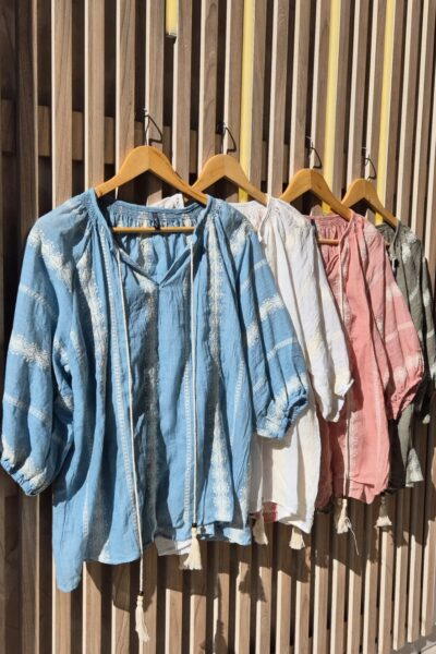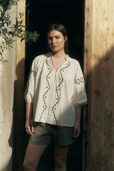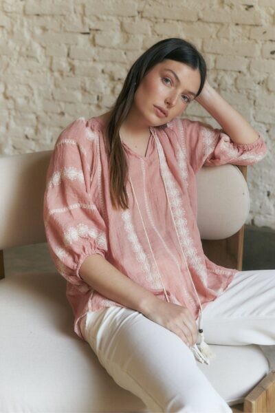 $22,500.00BLUSA KATIA CUELLO V MANGAS 3/4 CON ELÁSTICO. DETALLES BORDADOS Y CORDONES TERMINADOS EN BORLAS (IMPORTADO) / TALLE ÚNICO