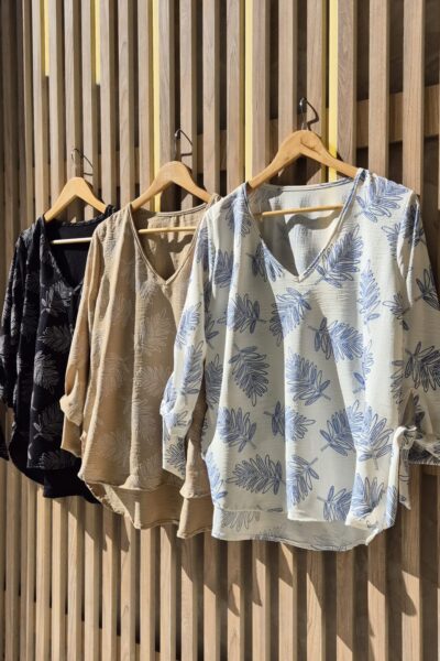 $12,500.00BLUSA NAIMA CUELLO V, MANGA GLOBO CON DETALLE DE TIRAS Y GUARDAS ESTAMPADA / TALLES M Y L