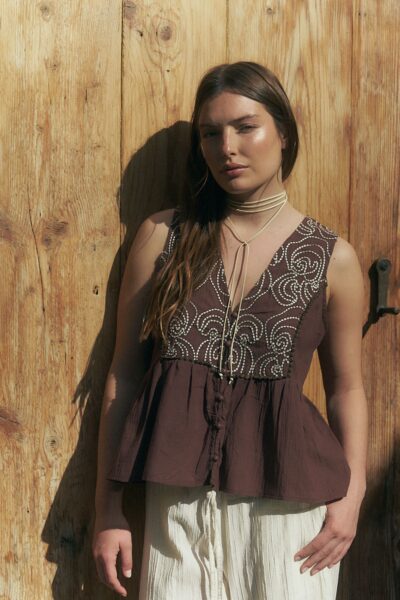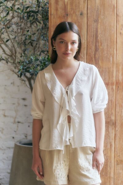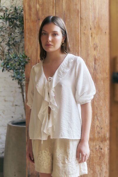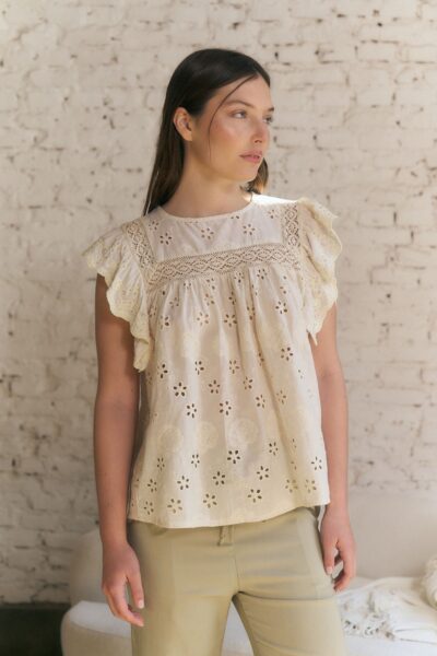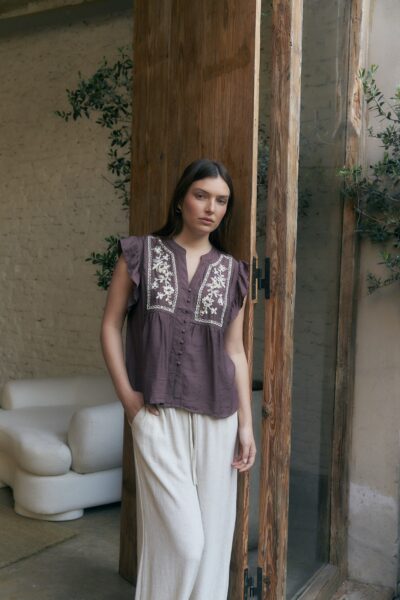 $24,800.00BLUSA NARA CUELLO V BORDADA CON LENTEJUELAS, BOTONES EN FRENTE Y VOLADOS EN MANGAS (IMPORTADO) / TALLES M Y L