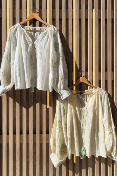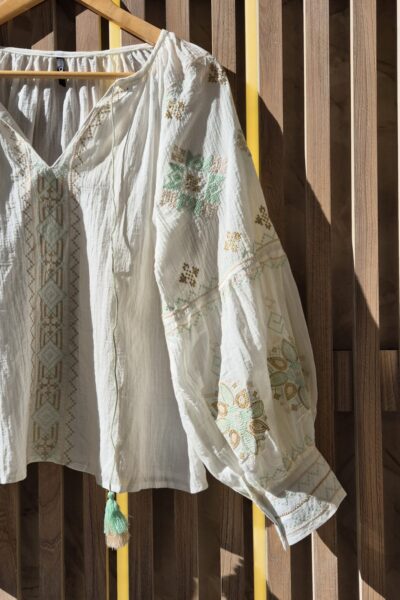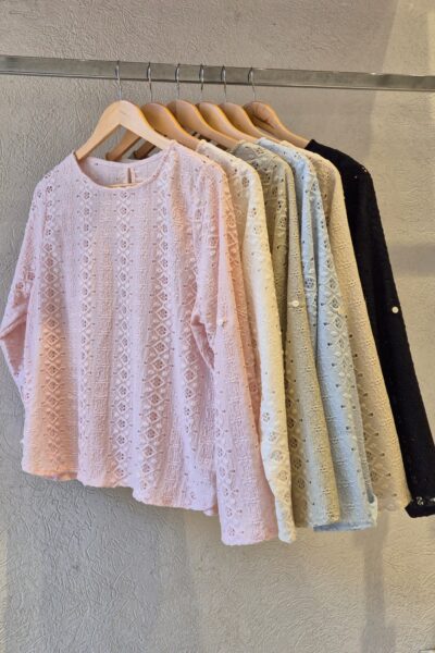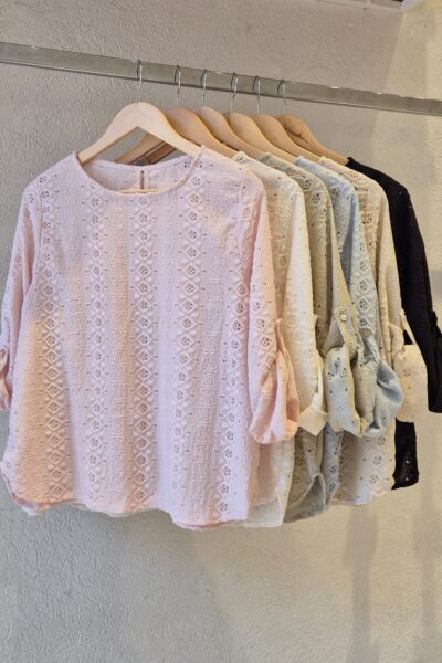 $10,900.00BLUSA DE BRODERIE CUELLO REDONDO MANGAS LARGAS CON TIRAS PARA ARREMANGAR Y DETALLE DE GOTA EN ESPALDA / TALLE UNICO