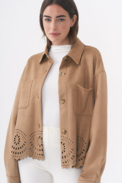 CAMPERA DE GAMUZA CON FORRADO. TIENE CIERRE FRONTAL Y DETALLES EN HOMBRO. / TALLES M Y L