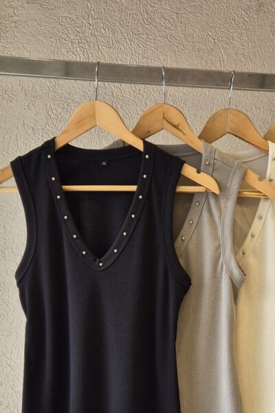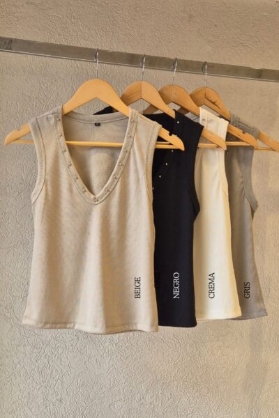 $8,500.00MUSCULOSA FATI CUELLO V CON DETALLE DE TACHAS / TALLES M Y L
