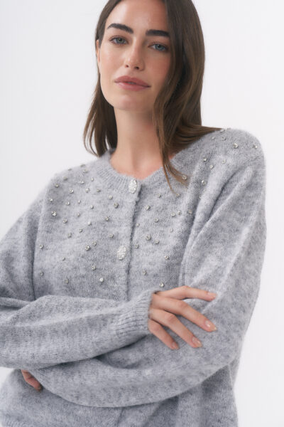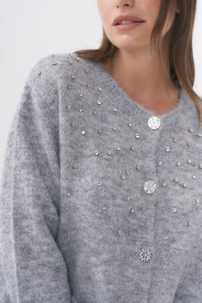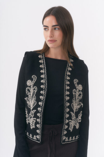 $29,000.00SACO DE PUNTO ABIERTO CON DETALLE DE TACHAS DE STRASS SALPICADO Y BOTONES METÁLICOS CON BRILLOS TRABAJADOS / TALLE ÚNICO