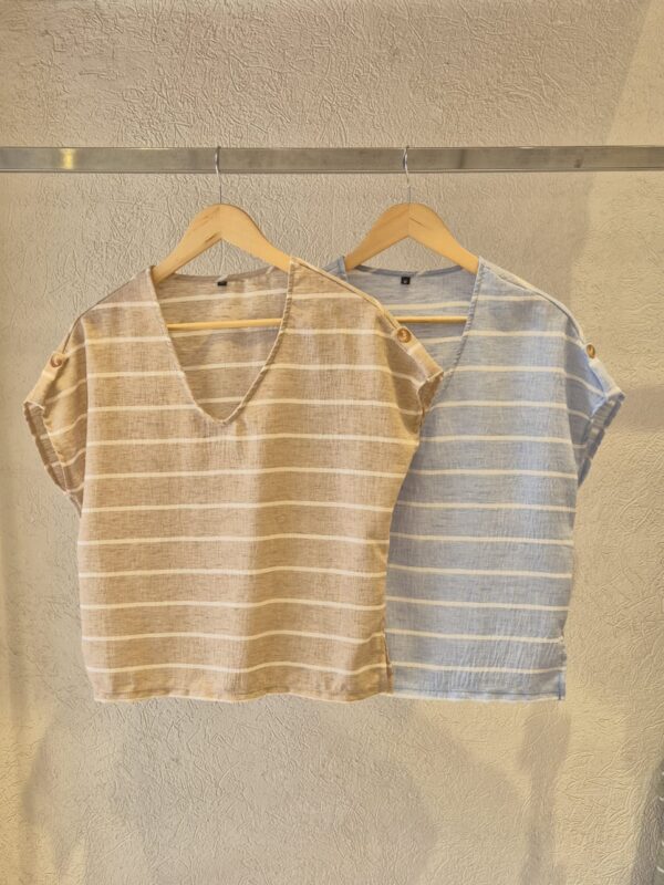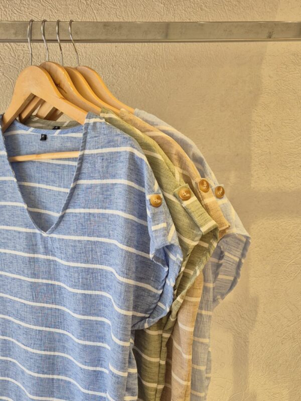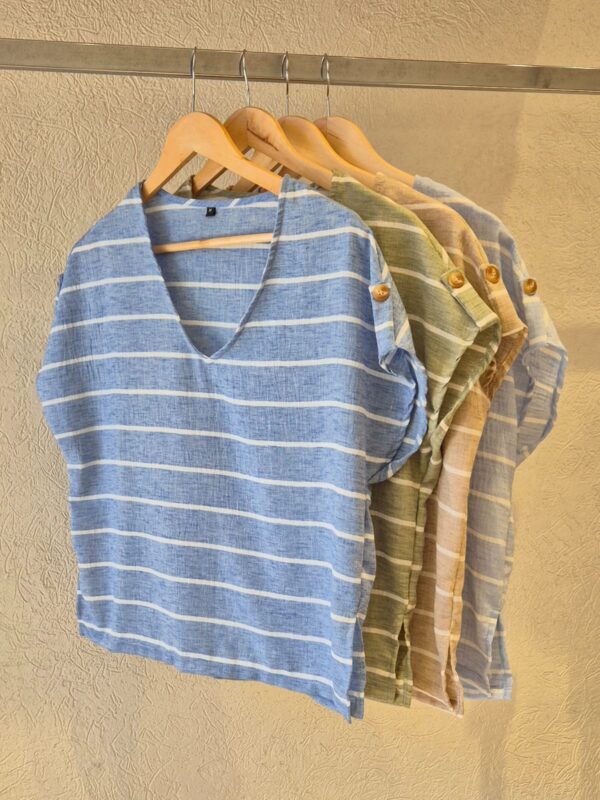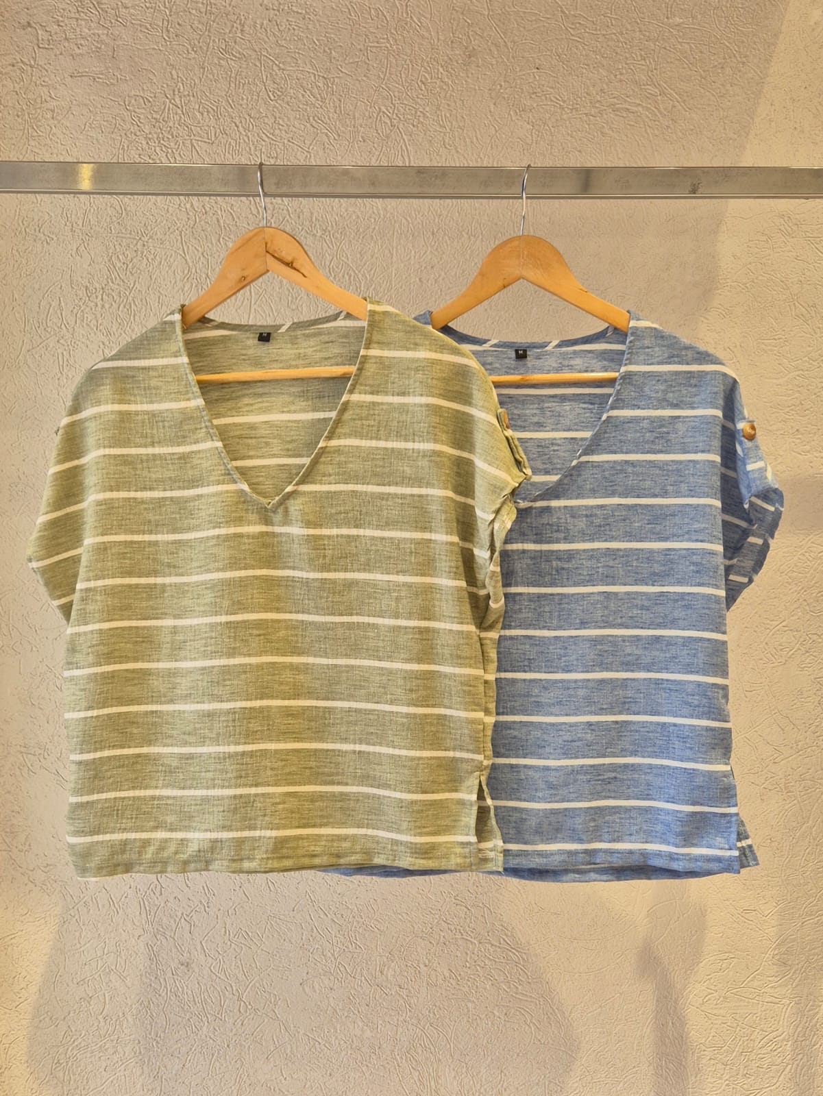 REMERA OLIVIA CUELLO V HOMBRO CAIDO CON DETALLE DE BOTON EN HOMBRO Y TAJO AL COSTADO / TALLES M Y L