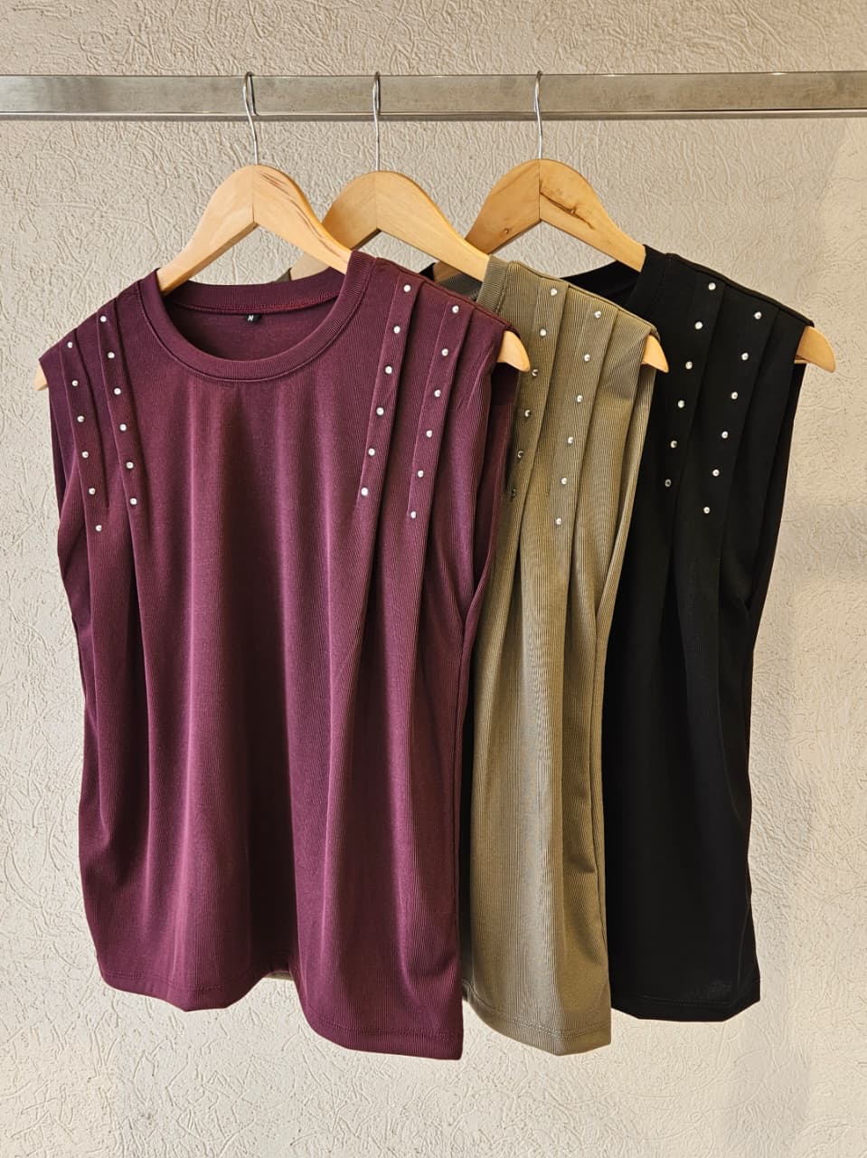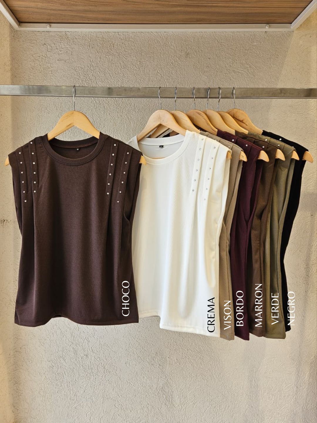 MUSCULOSA REGINA CUELLO REDONDO CON DETALLE DE TACHAS PLATEADAS Y BRILLANTES / TALLES M Y L