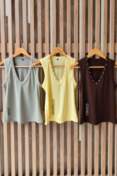 $8,500.00MUSCULOSA FATI CUELLO V CON DETALLE DE TACHAS / TALLES M Y L