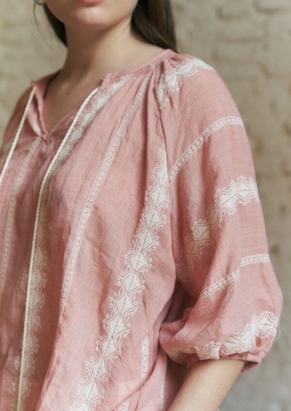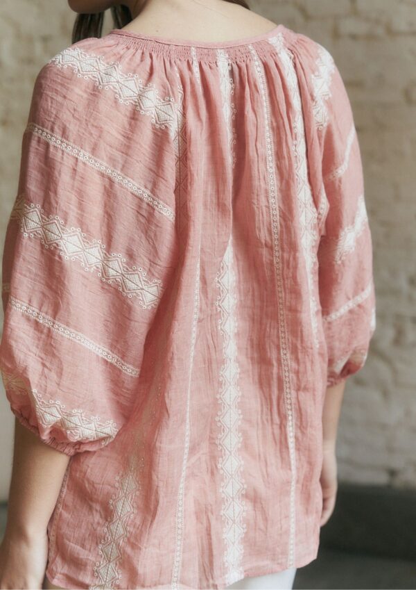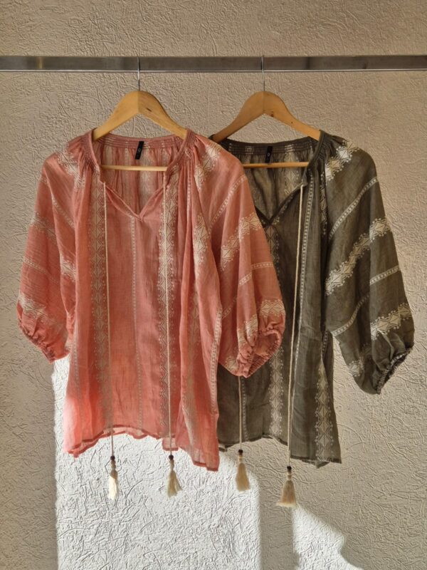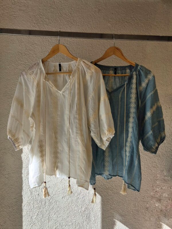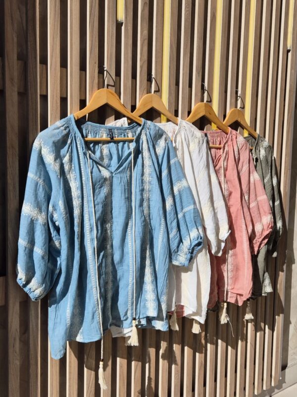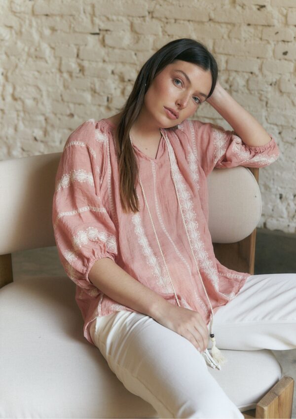 BLUSA KATIA CUELLO V MANGAS 3/4 CON ELÁSTICO. DETALLES BORDADOS Y CORDONES TERMINADOS EN BORLAS (IMPORTADO) / TALLE ÚNICO