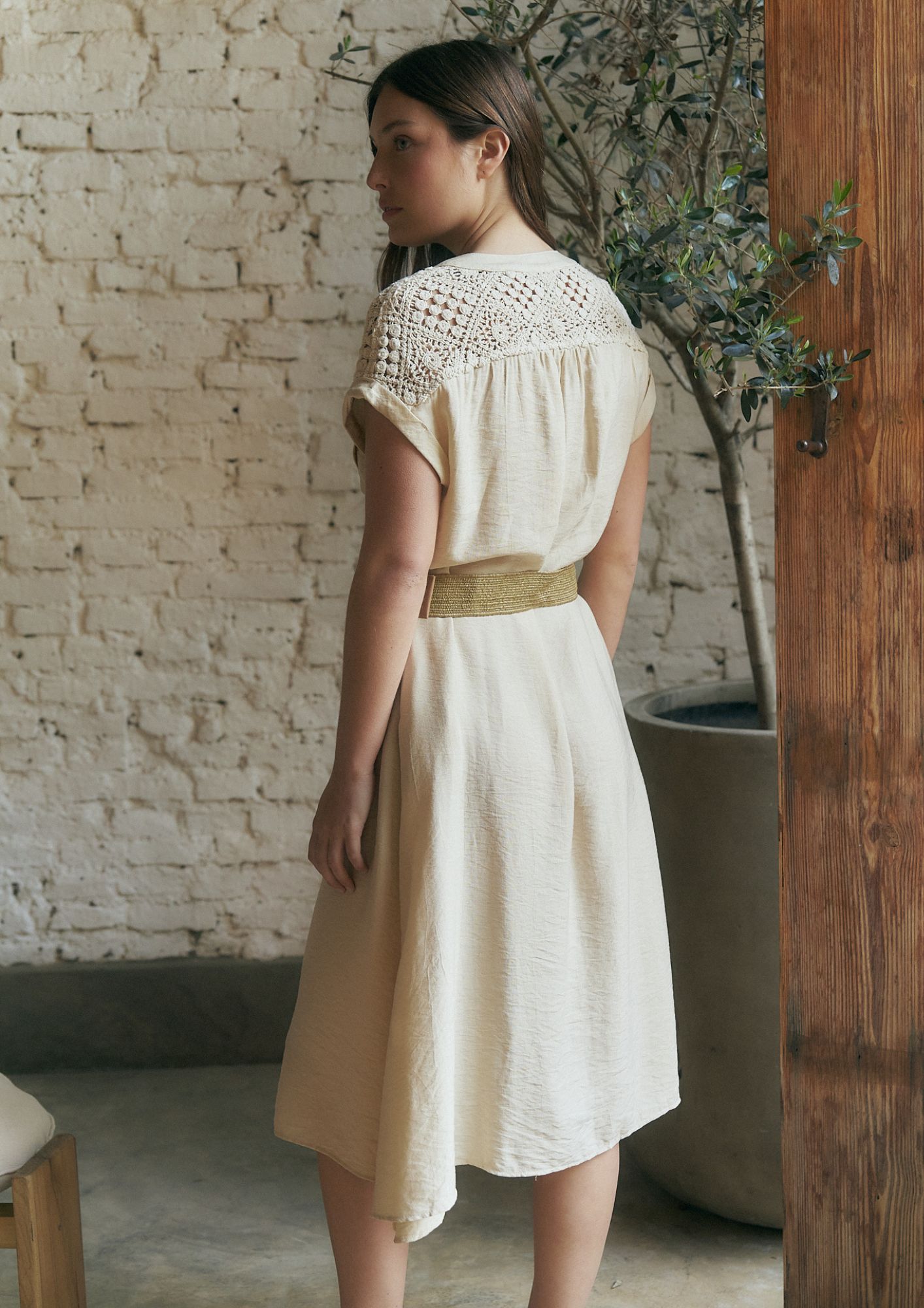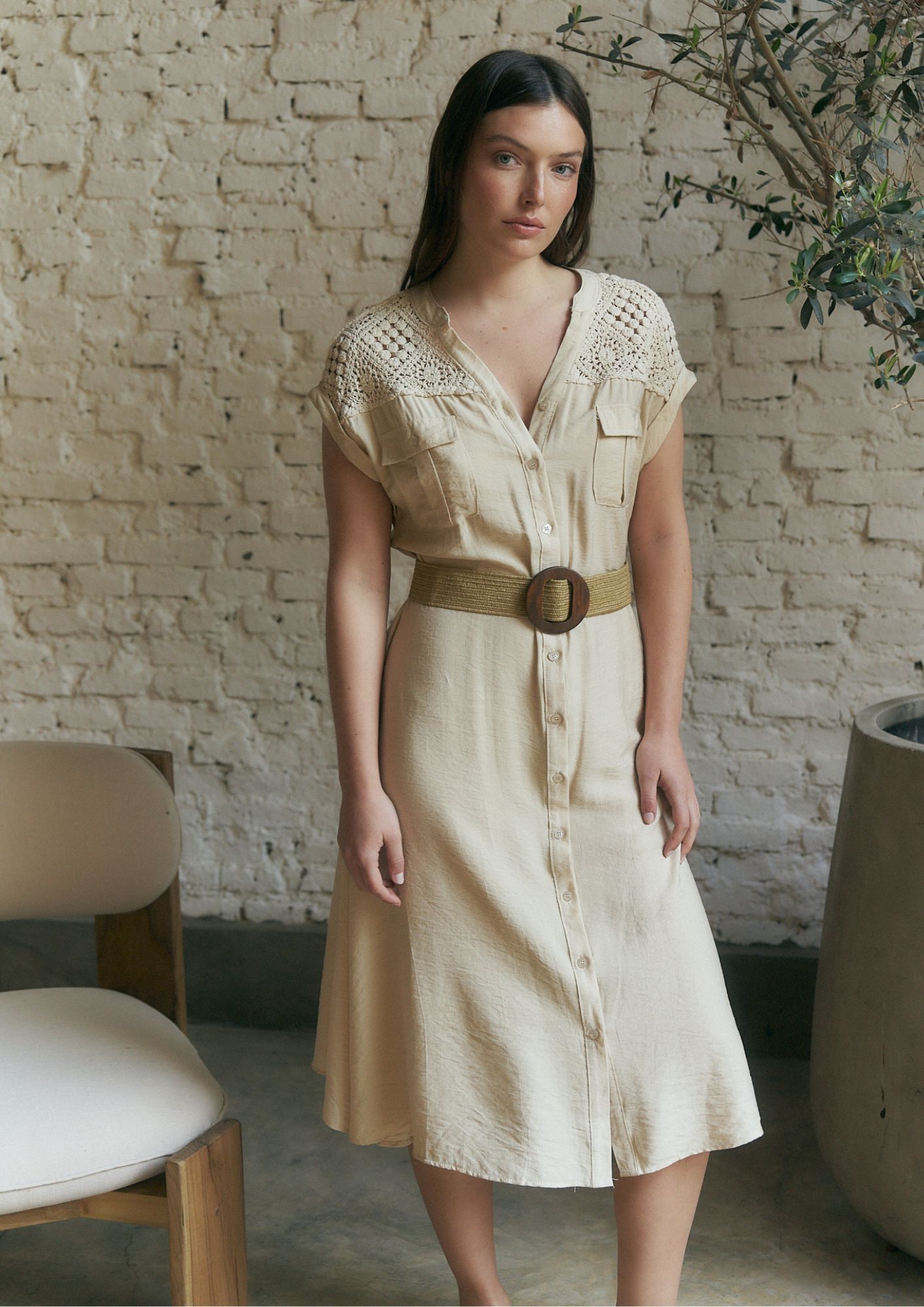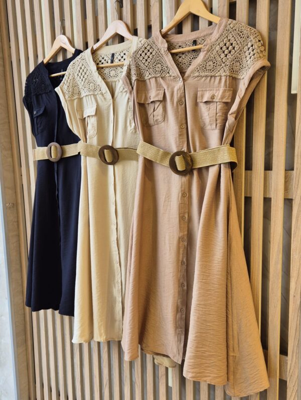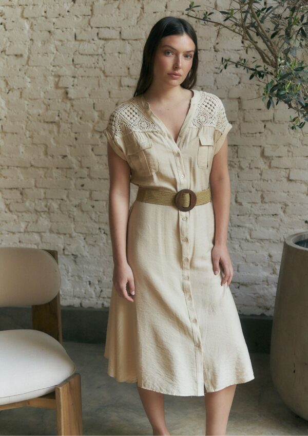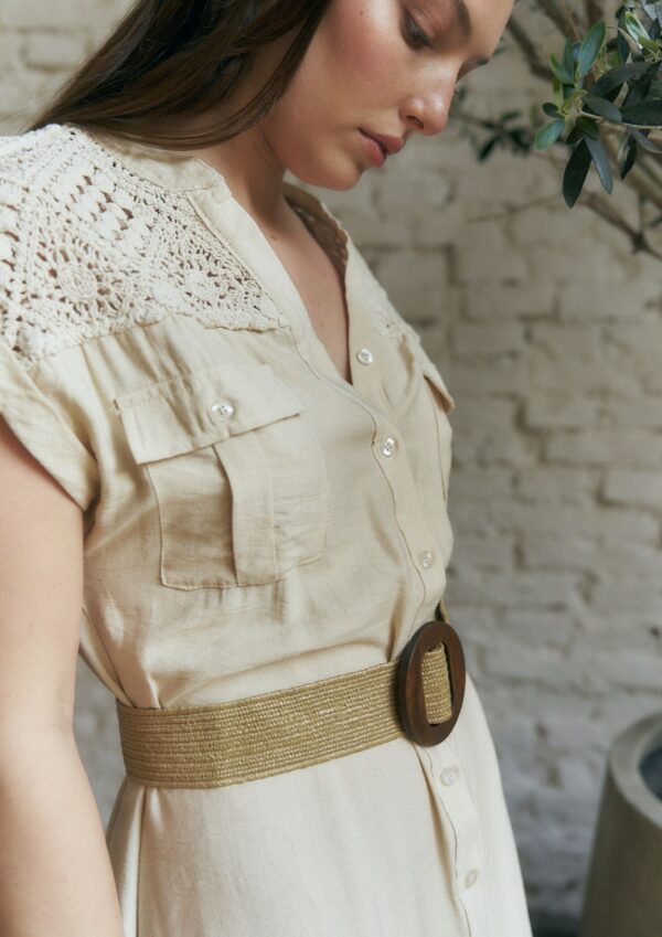 VESTIDO MORA CUELLO MAO V CON BOTONES EN FRENTE, BOLSILLOS Y CINTO (IMPORTADO) / TALLES M Y L