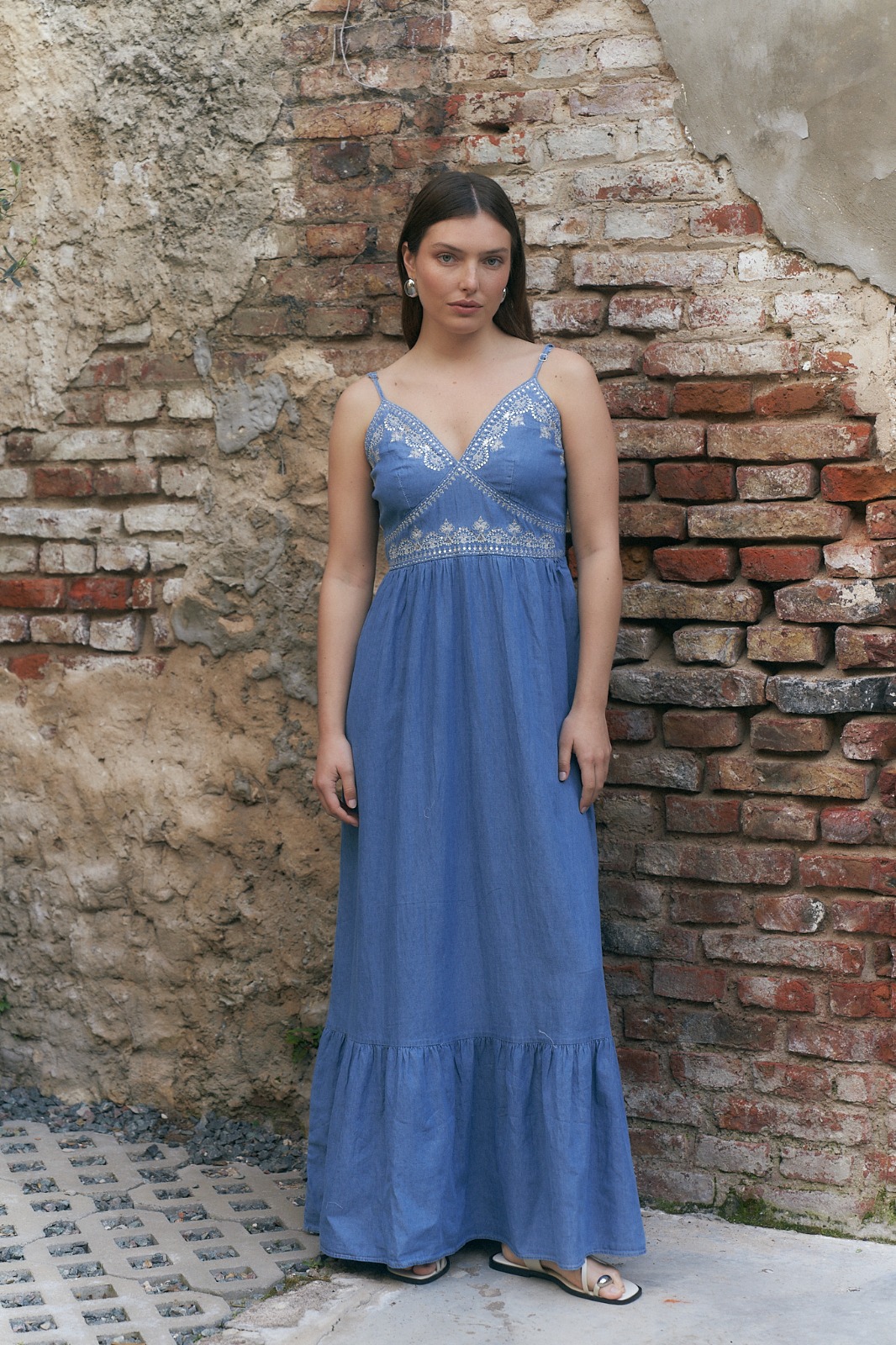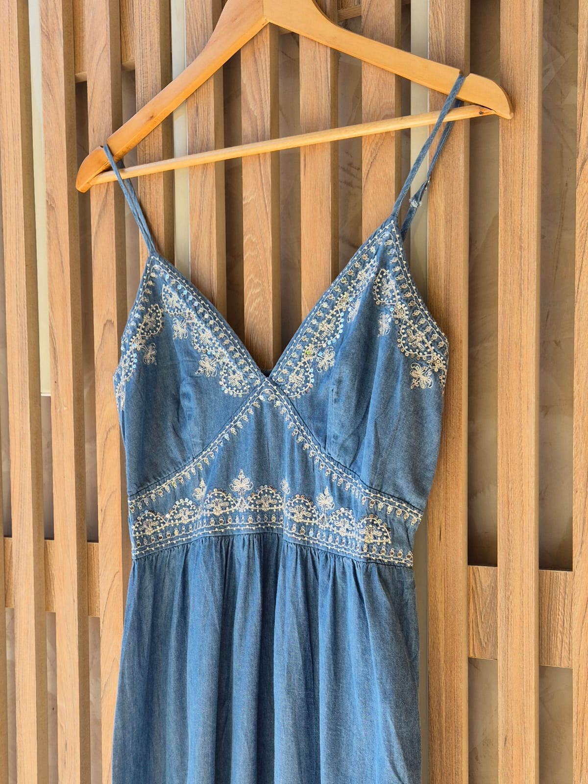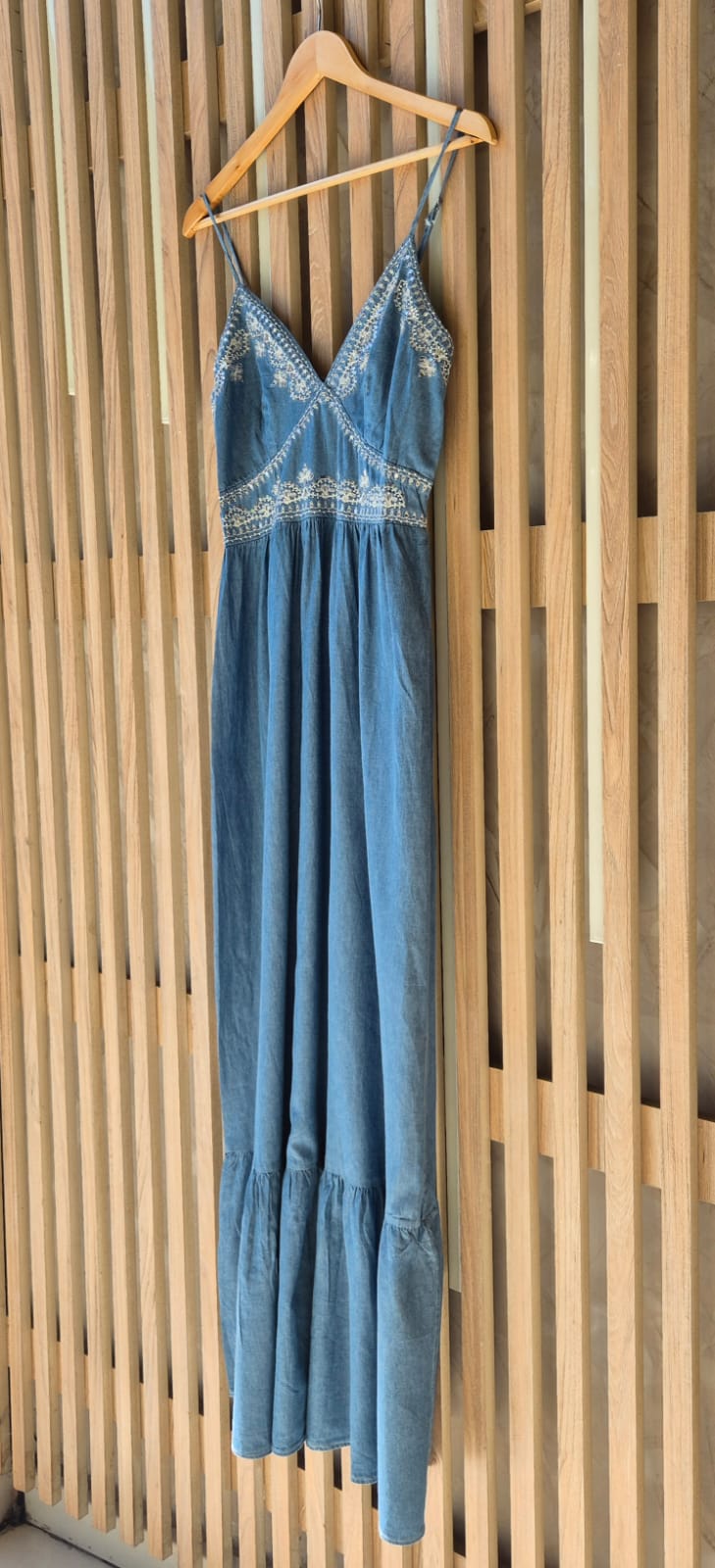 VESTIDO CUELLO V CON ELASTICO EN LA ESPALDA, DETALLE DE BORDADOS Y LENTEJUELAS, VOLADO INFERIOR, TIRAS AJUSTABLES / TALLES M Y L