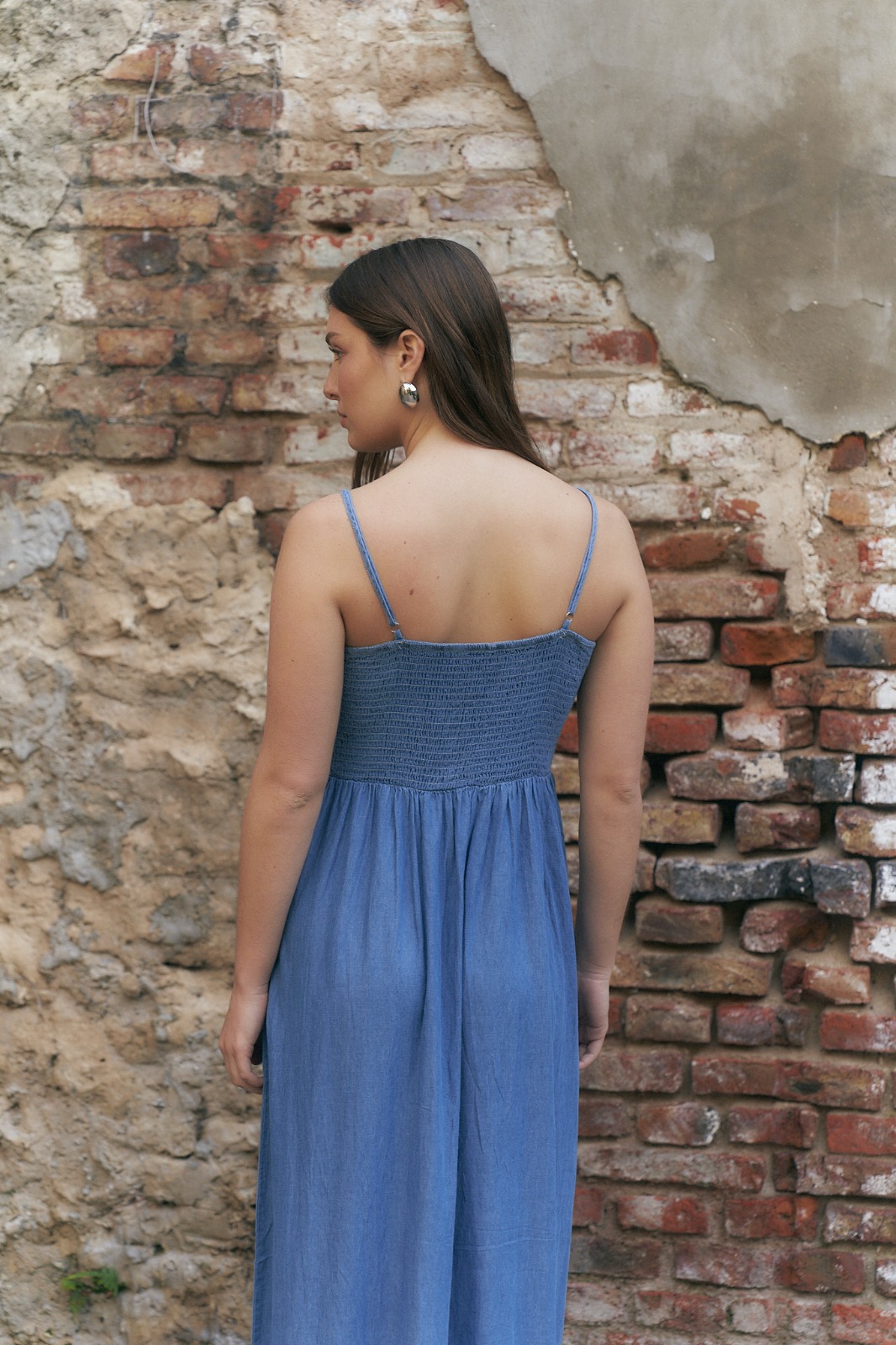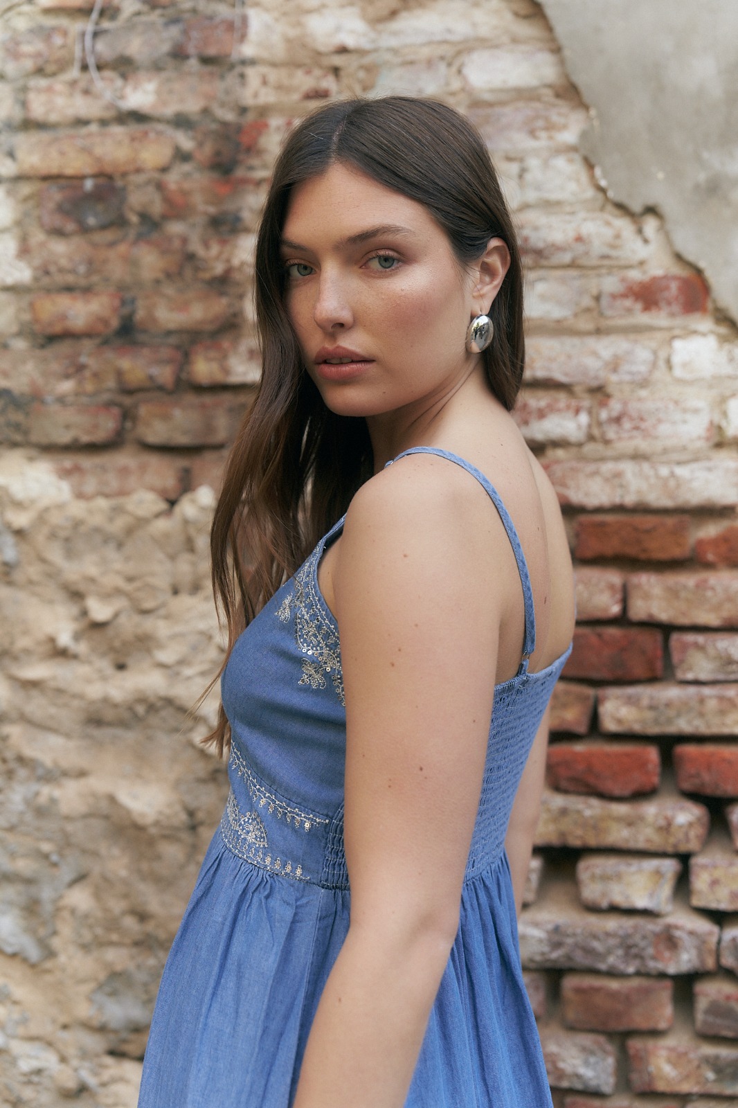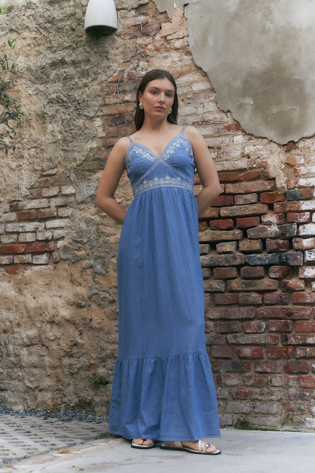 VESTIDO CUELLO V CON ELASTICO EN LA ESPALDA, DETALLE DE BORDADOS Y LENTEJUELAS, VOLADO INFERIOR, TIRAS AJUSTABLES / TALLES M Y L