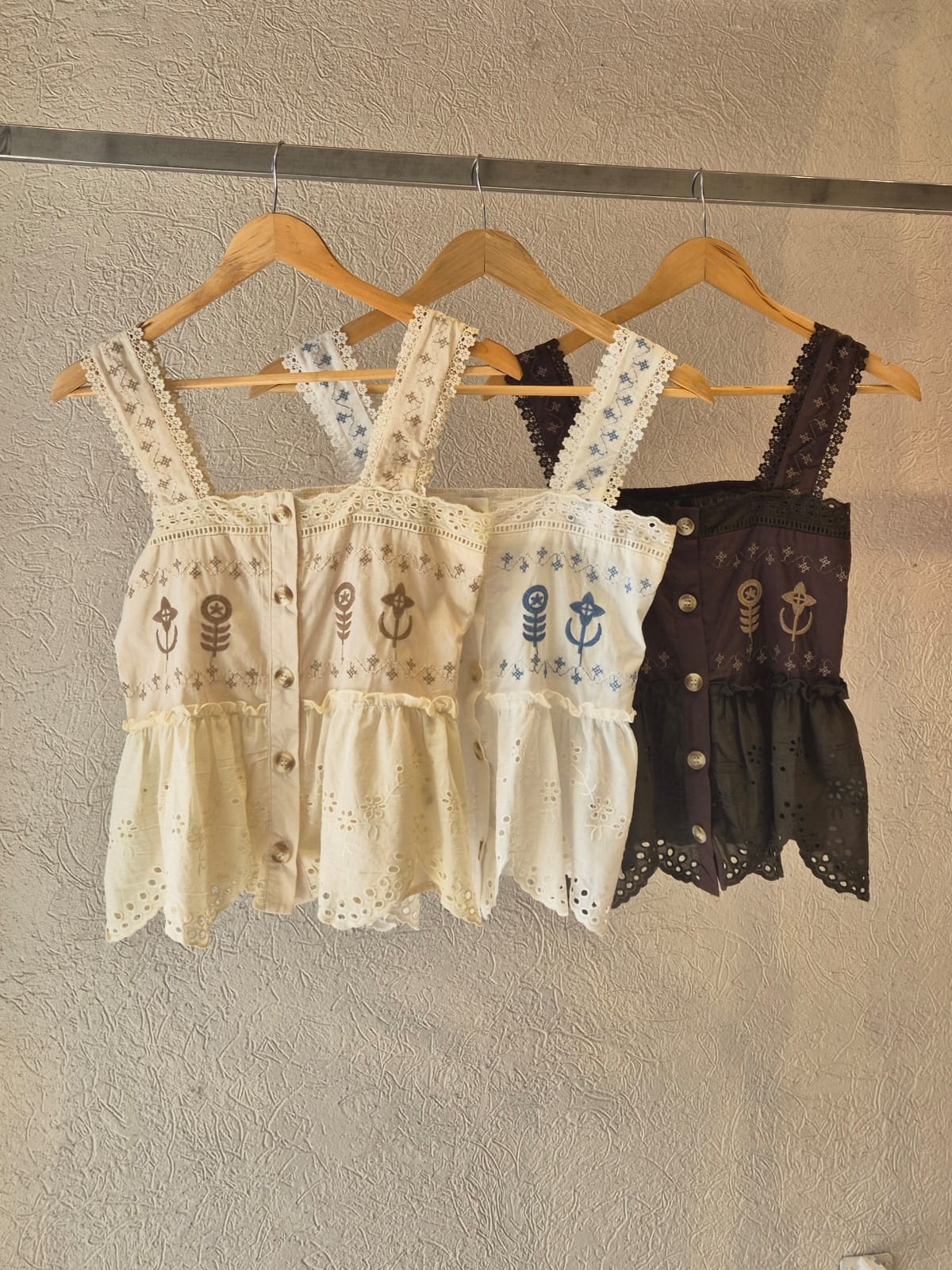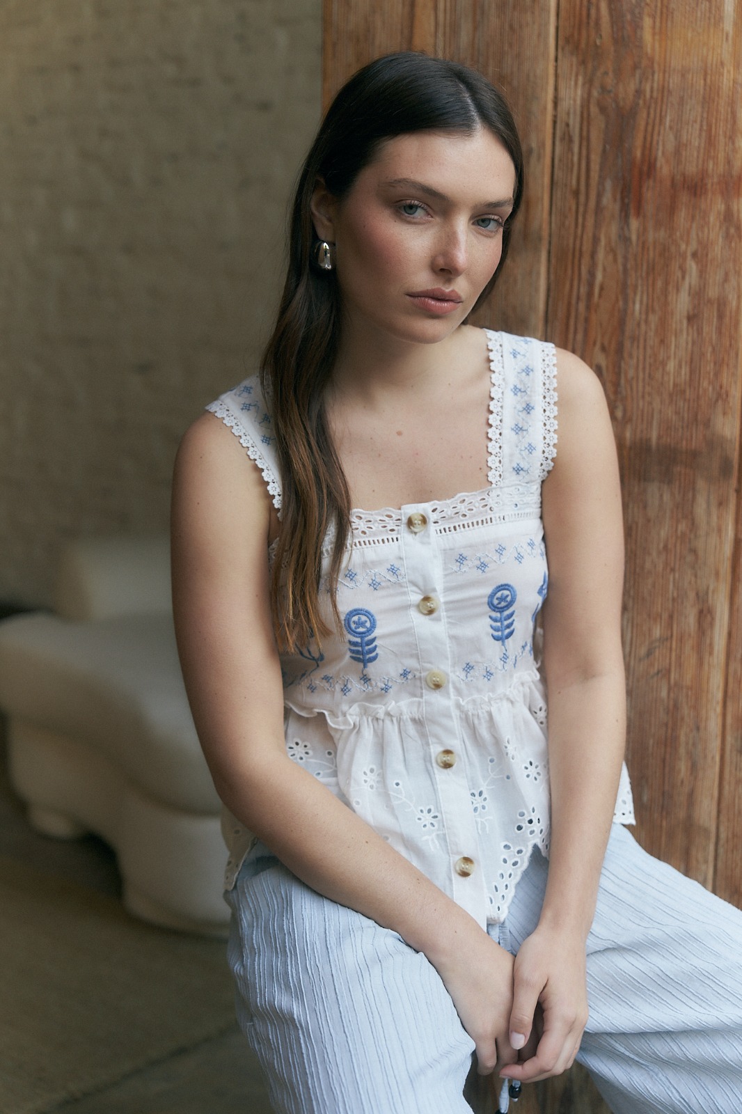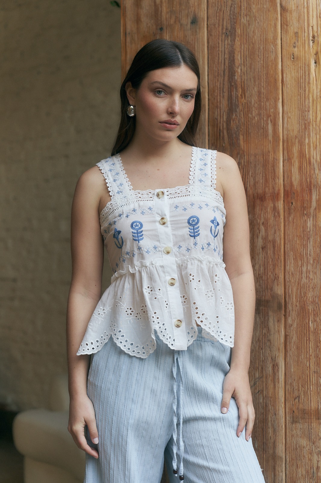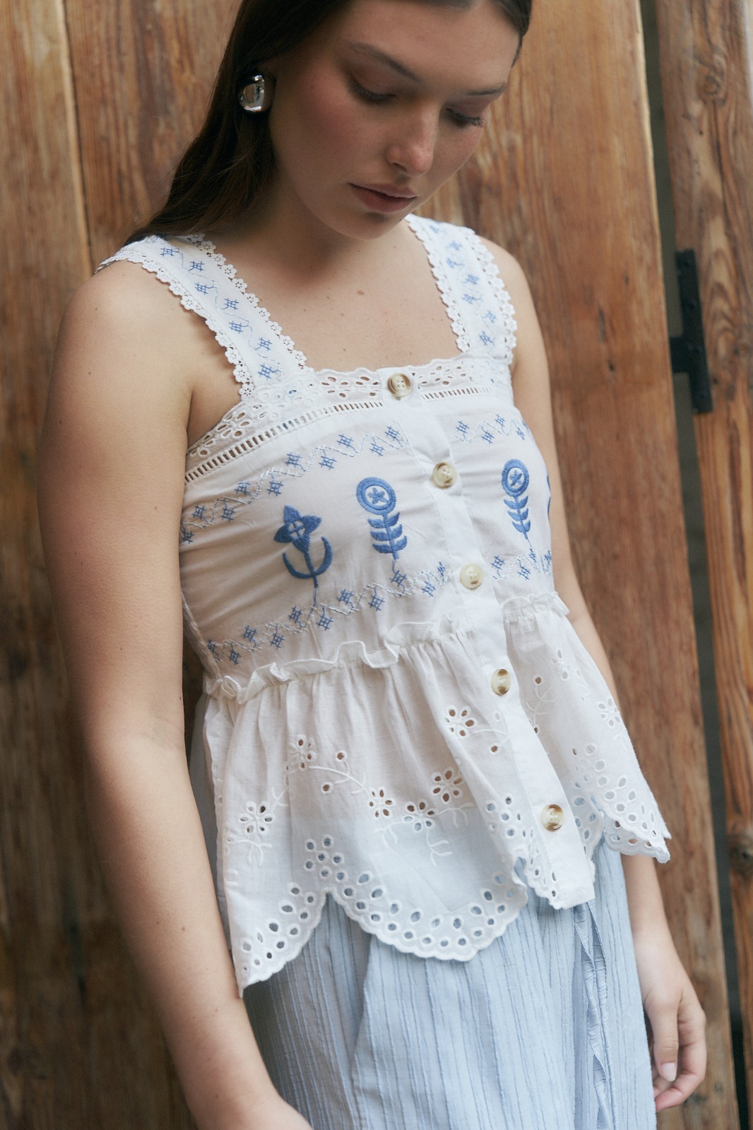 MUSCULOSA ANDRE CON VOLADOS Y BOTONES, DETALLES DE BORDADO Y CROCHET. TIENE ELASTICO EN LA PARTE DE LA ESPALDA (IMPORTADO) / TALLES M Y L