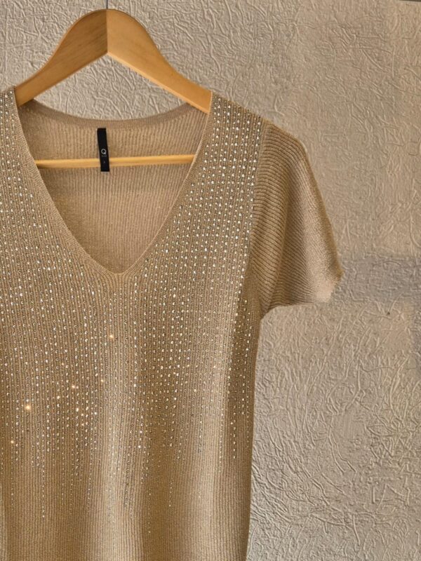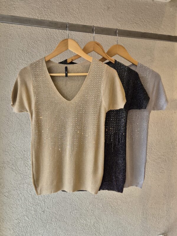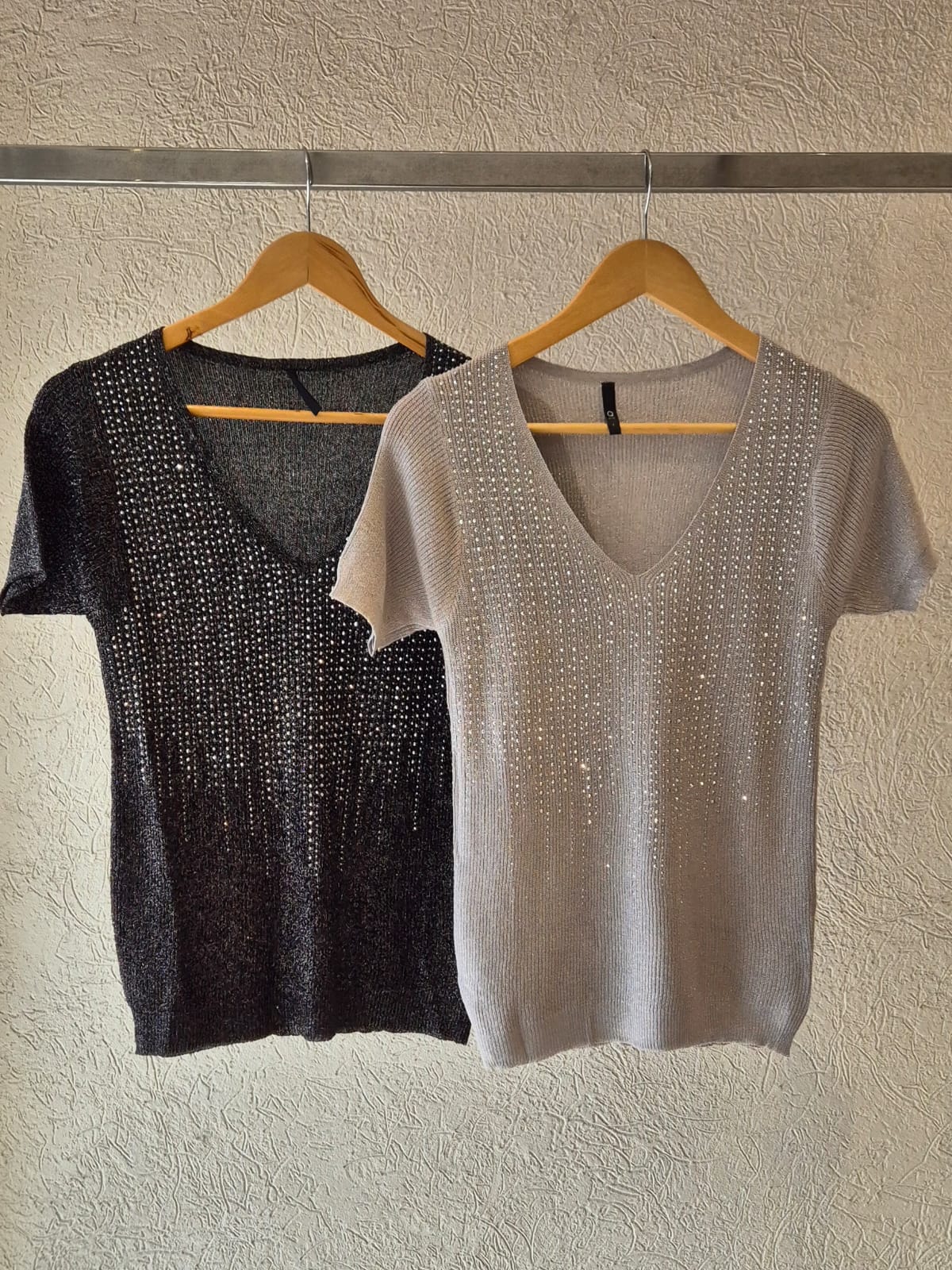 REMERA PRAGA CUELLO V DE HILO CON HOT-FIX (IMPORTADO) / TALLE ÚNICO
