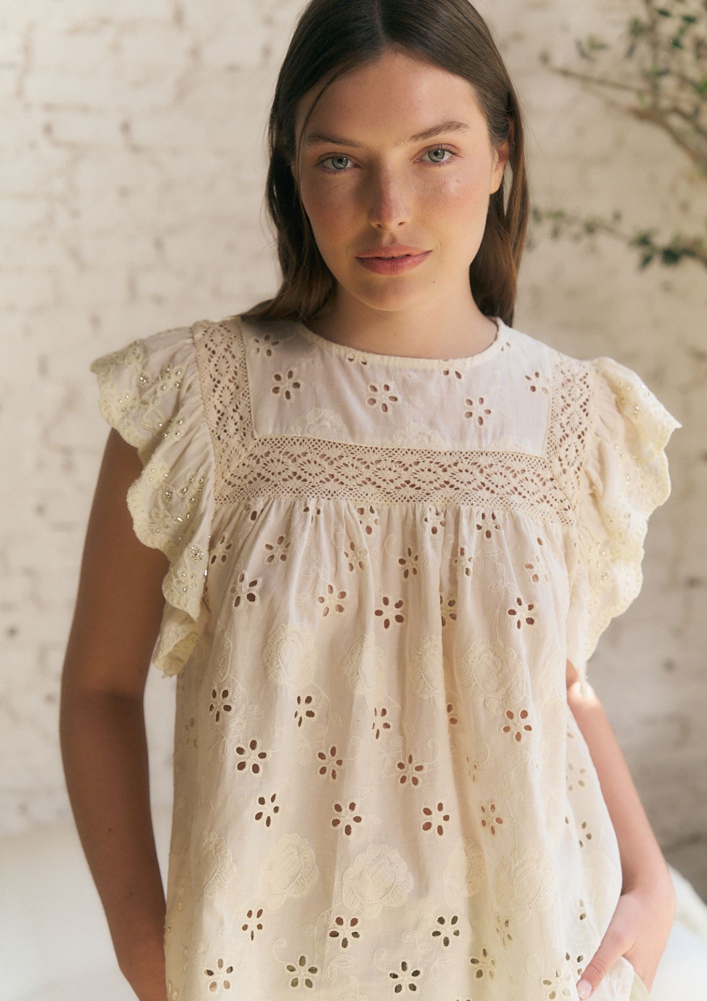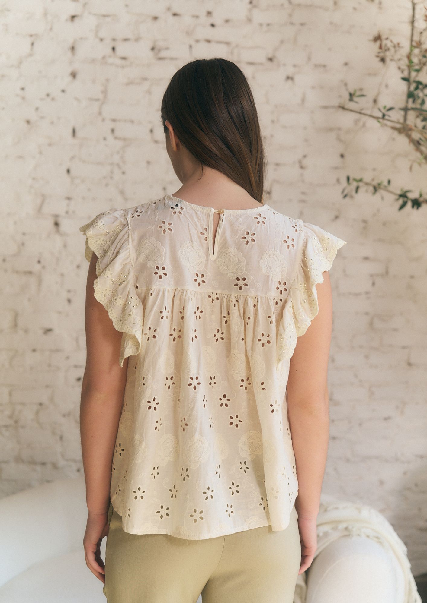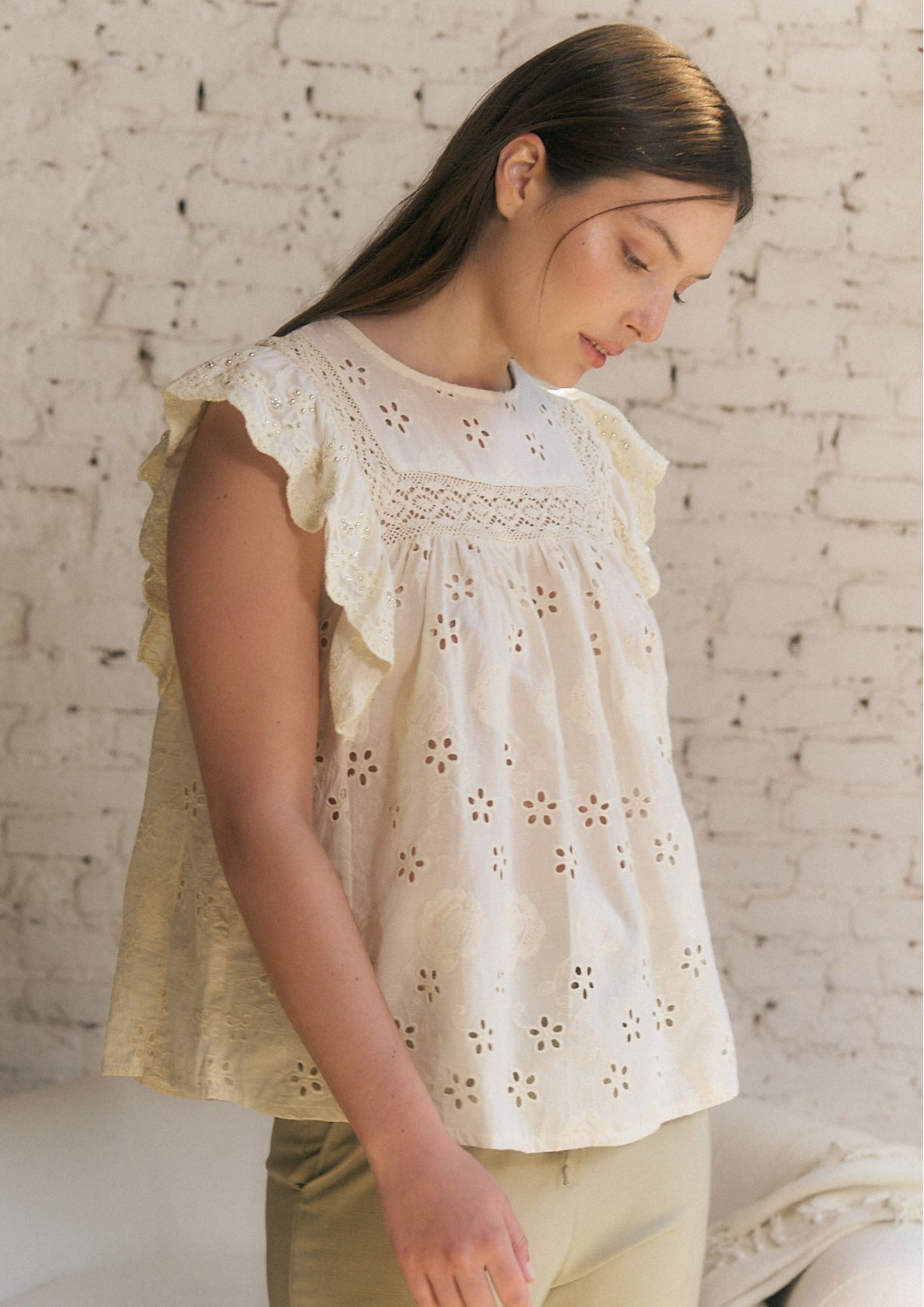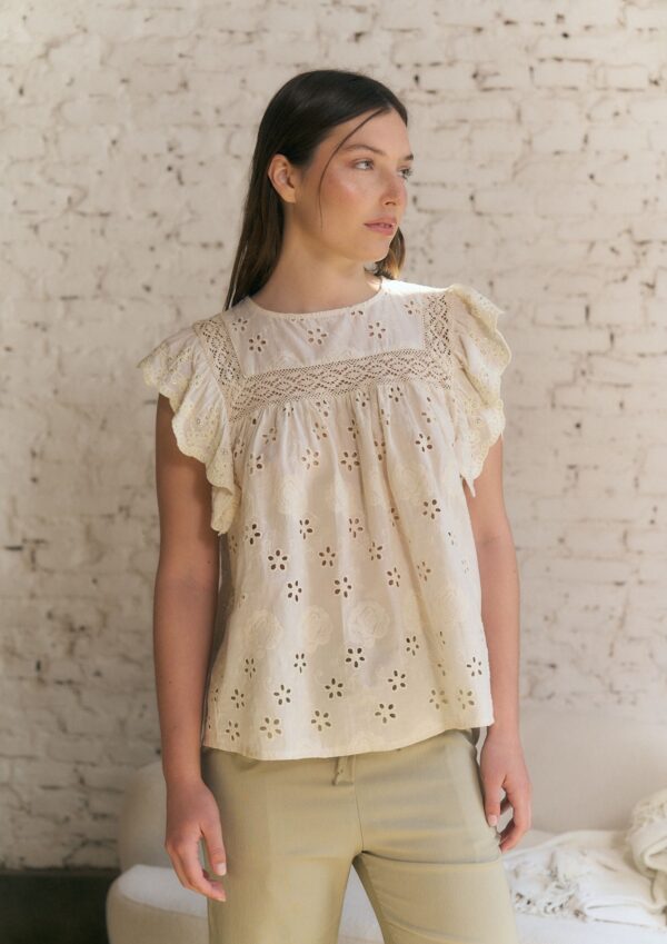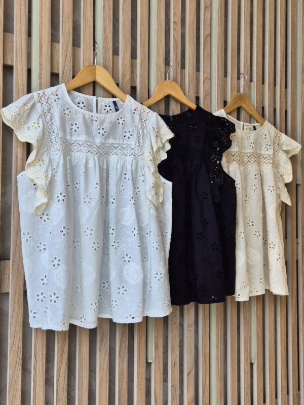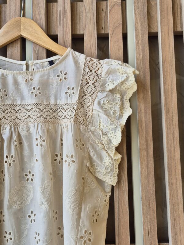 BLUSA DE LINO BORDADO CON PUNTILLA Y LENTEJUELAS (IMPORTADO) / TALLES M Y L