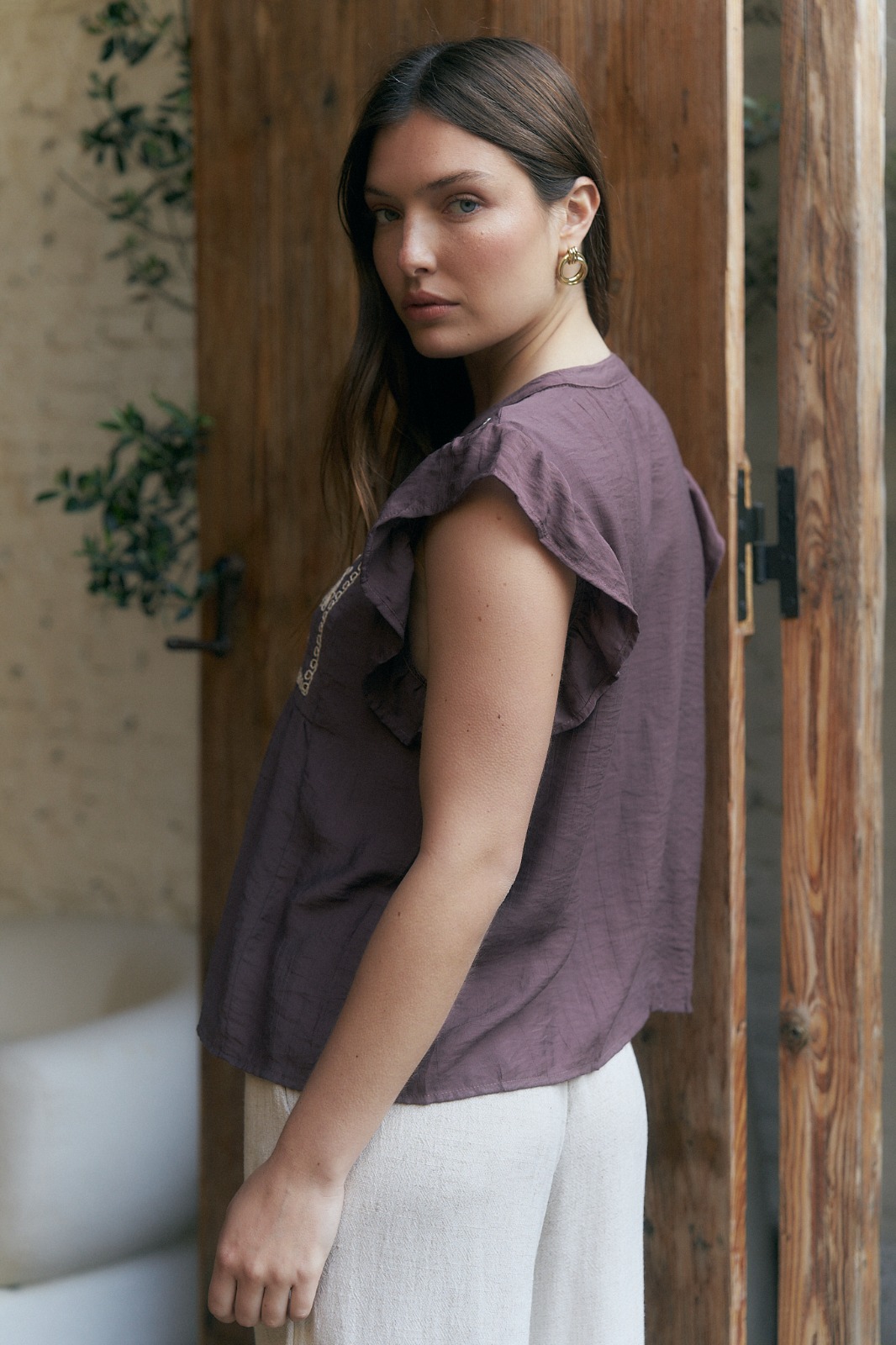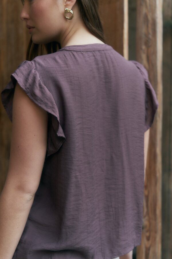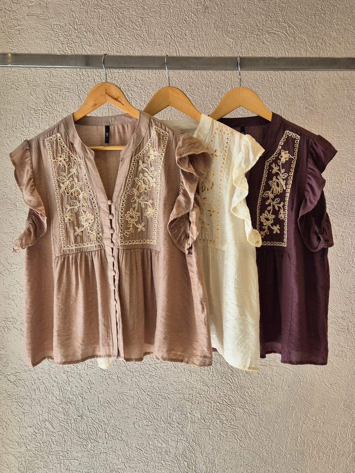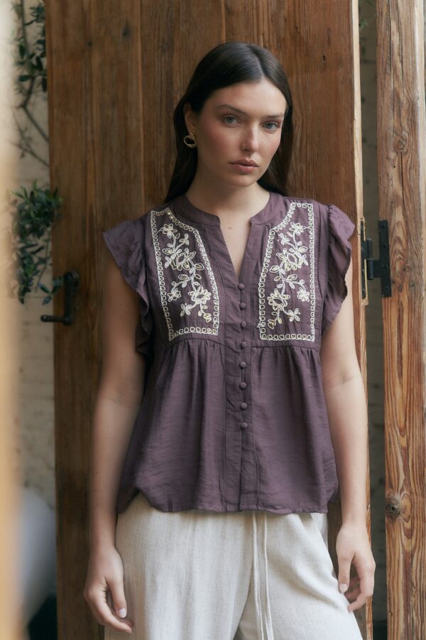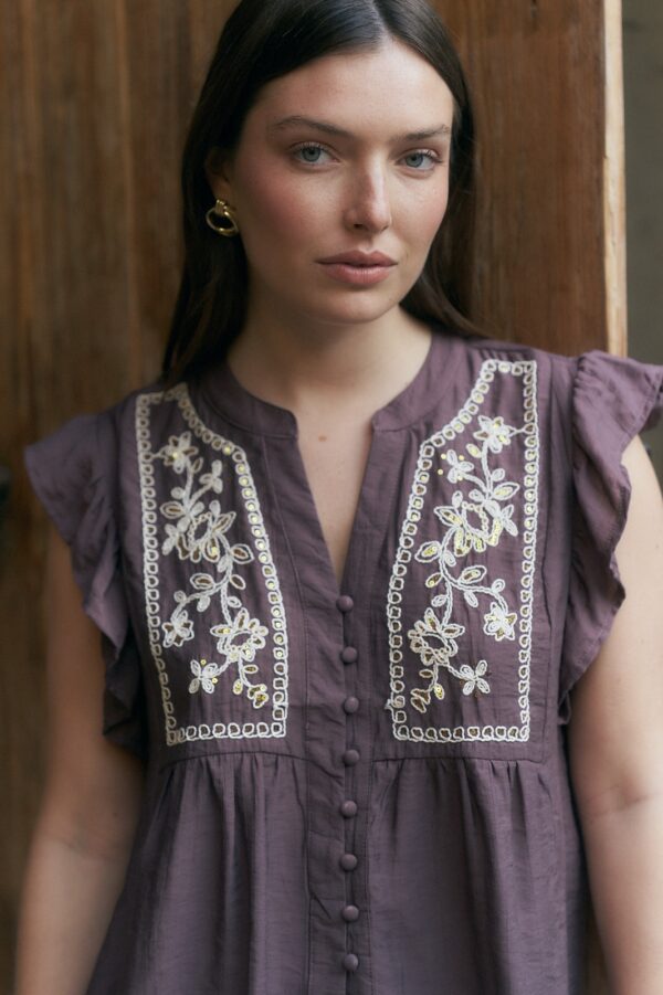 BLUSA NARA CUELLO V BORDADA CON LENTEJUELAS, BOTONES EN FRENTE Y VOLADOS EN MANGAS (IMPORTADO) / TALLES M Y L