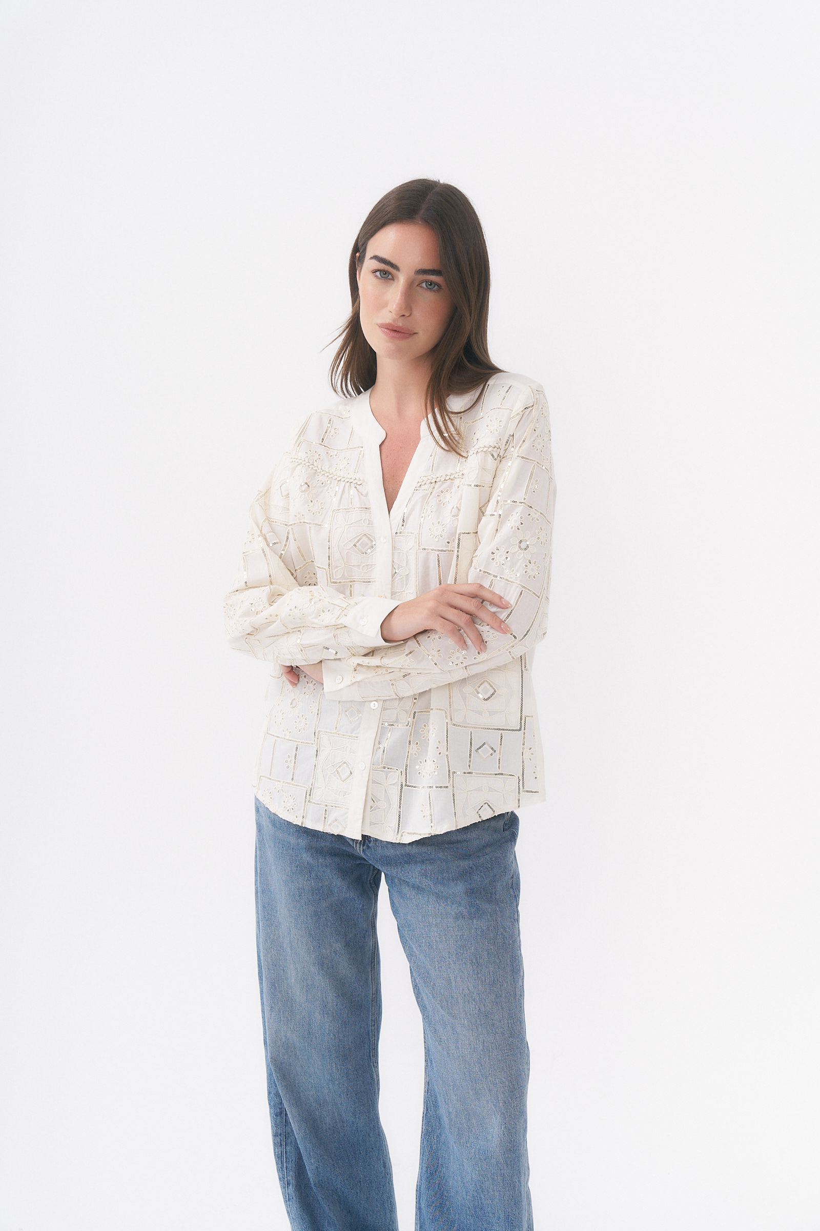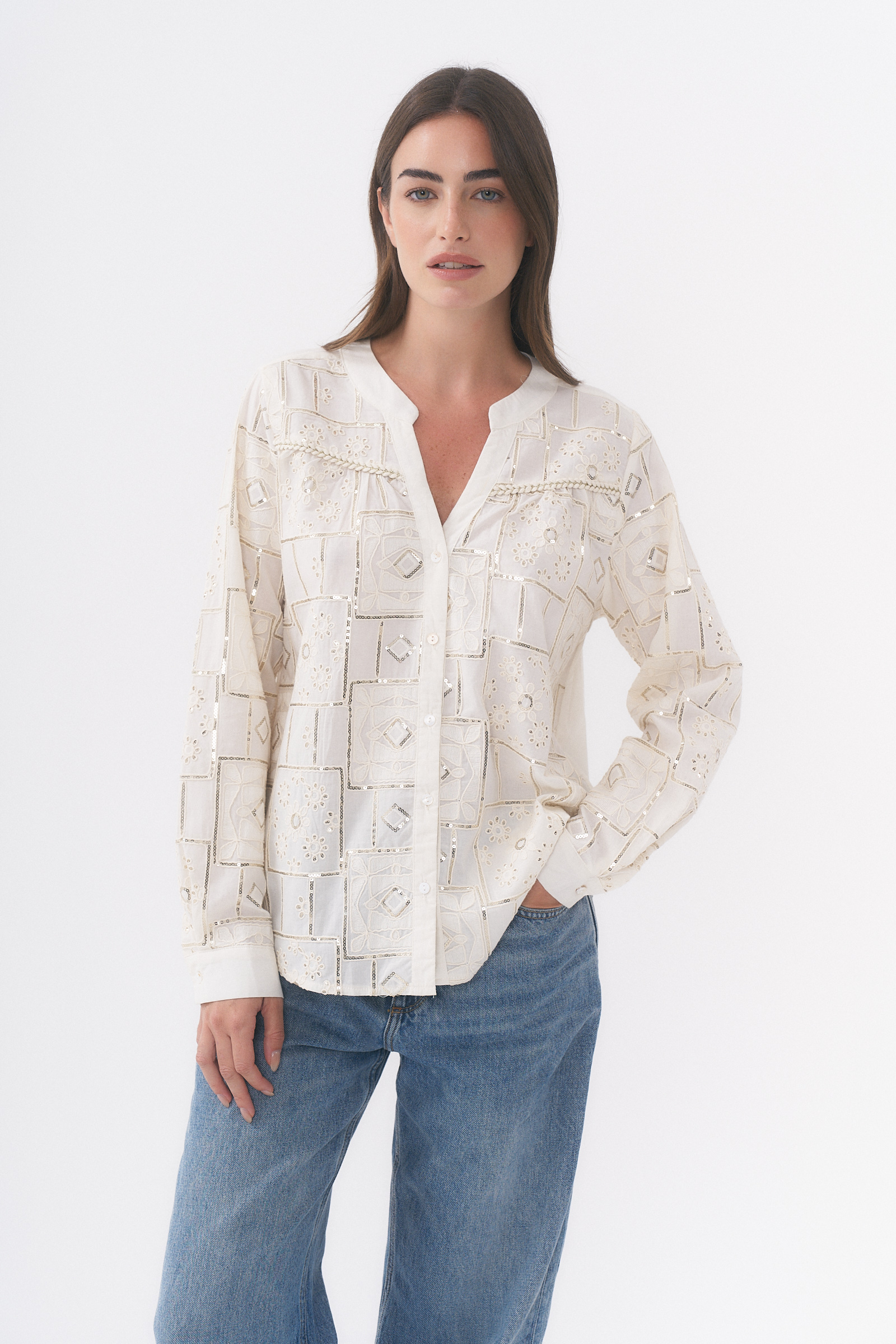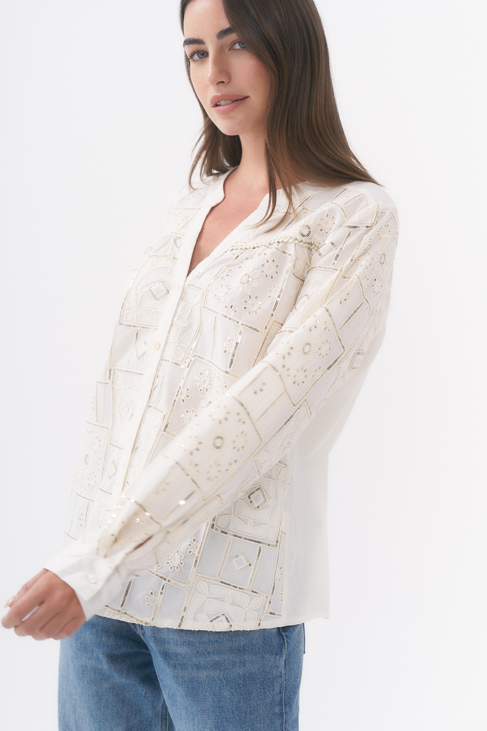 Camisa manga larga con detalle de bordado y lentejuelas / Talles M y L