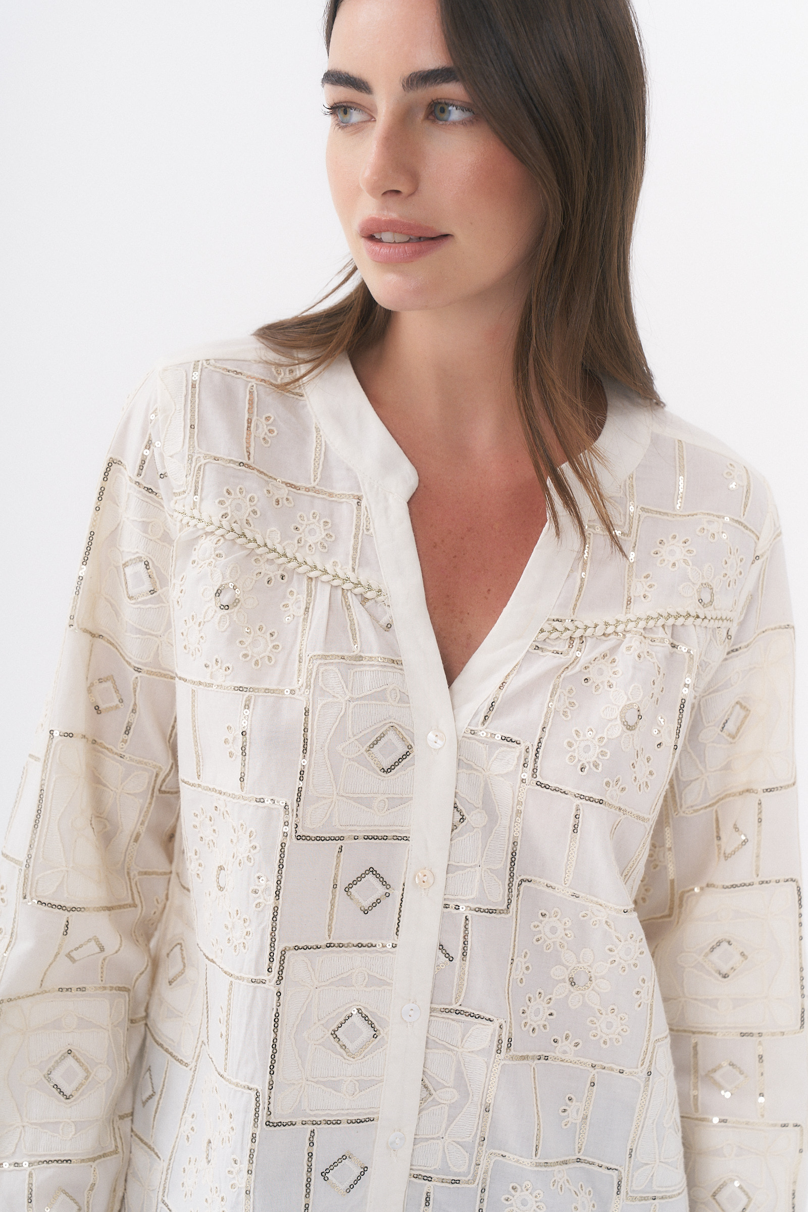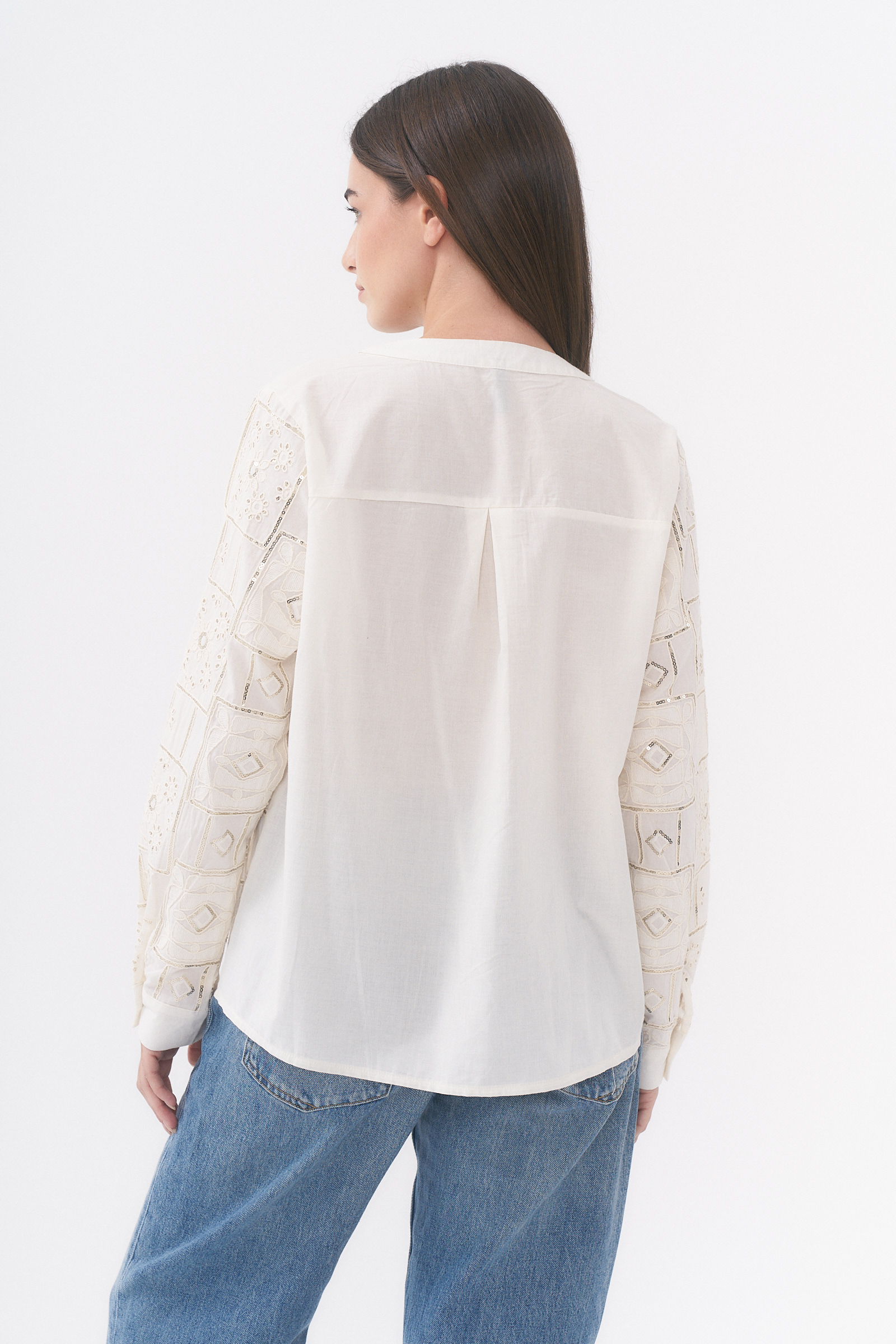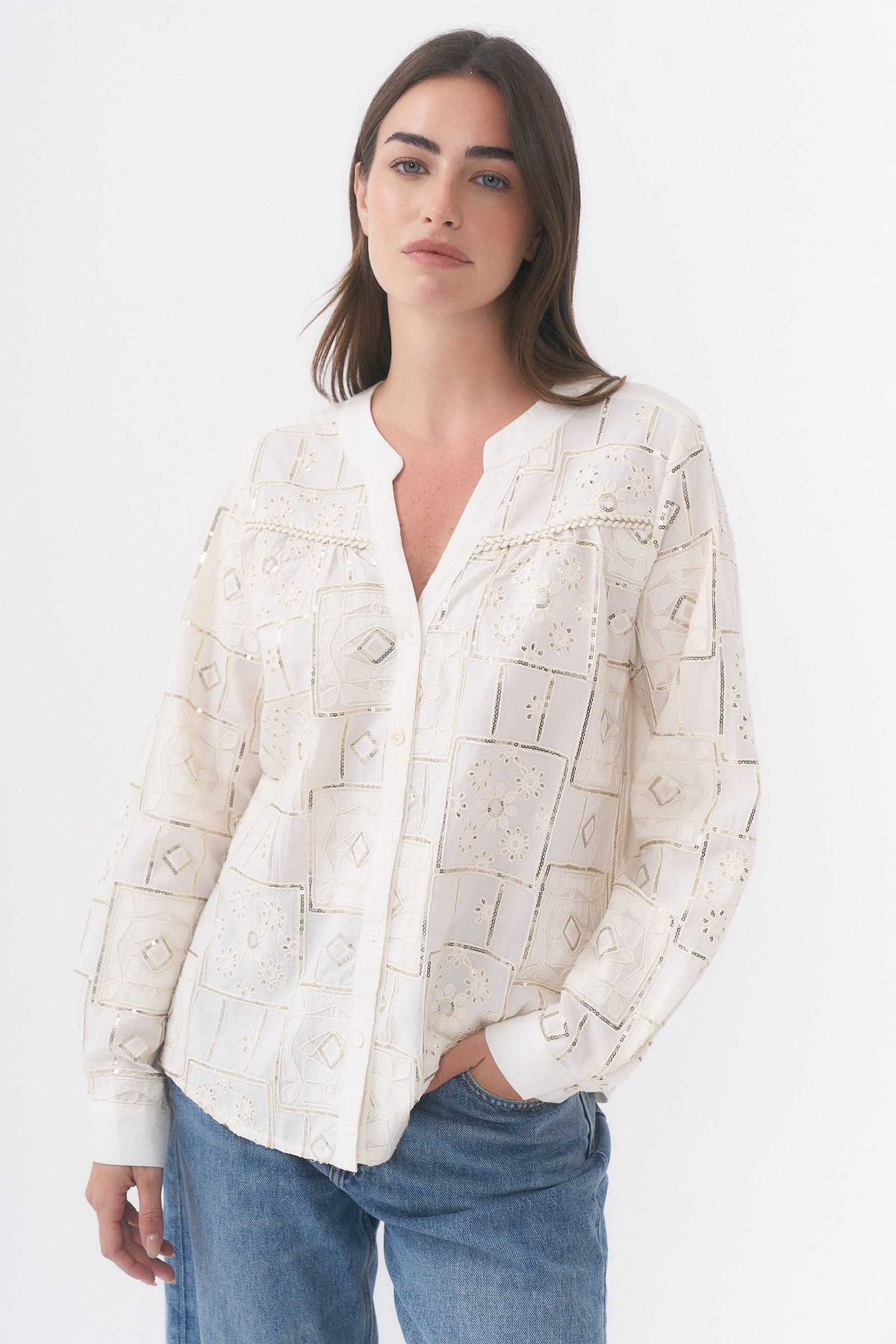 Camisa manga larga con detalle de bordado y lentejuelas / Talles M y L
