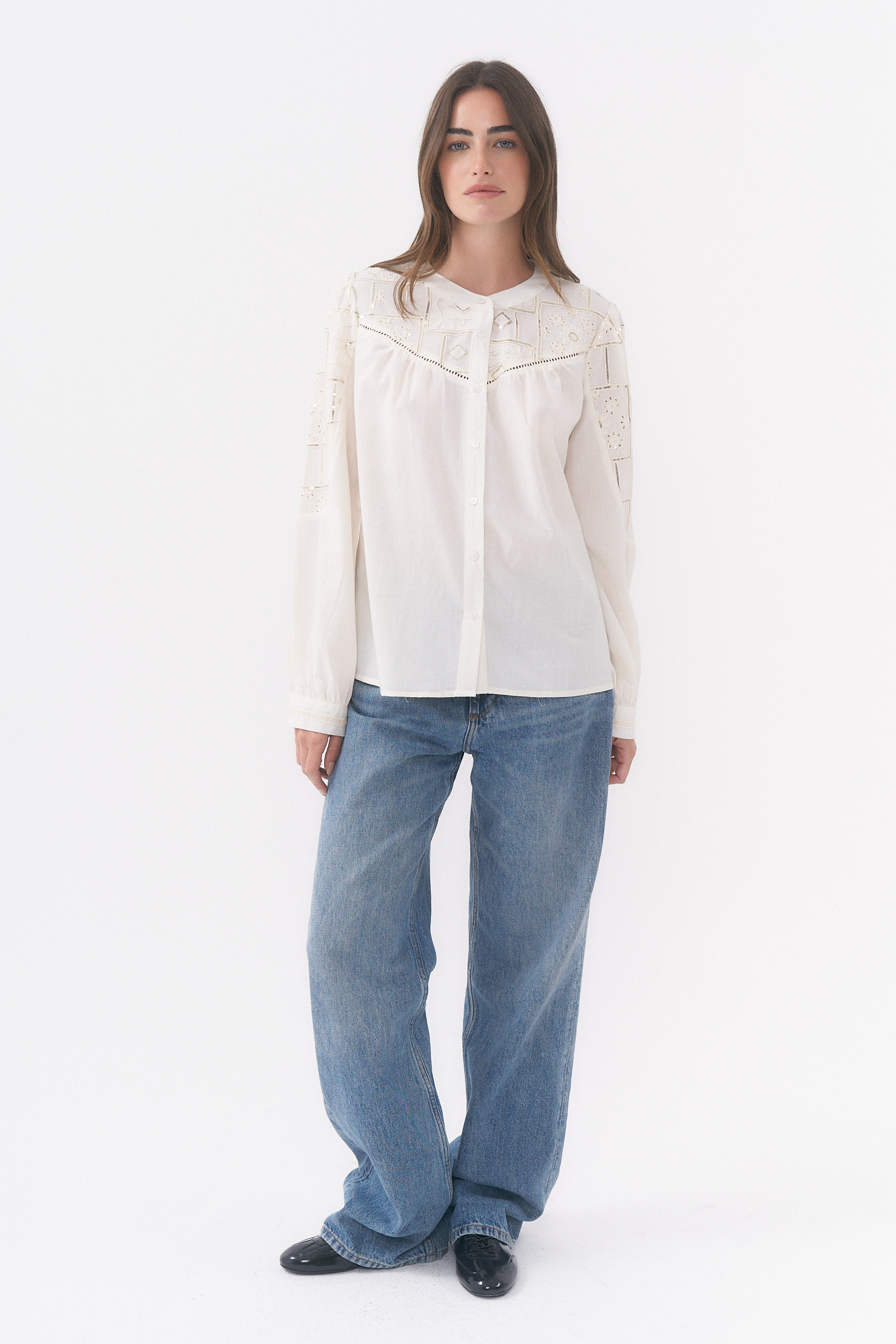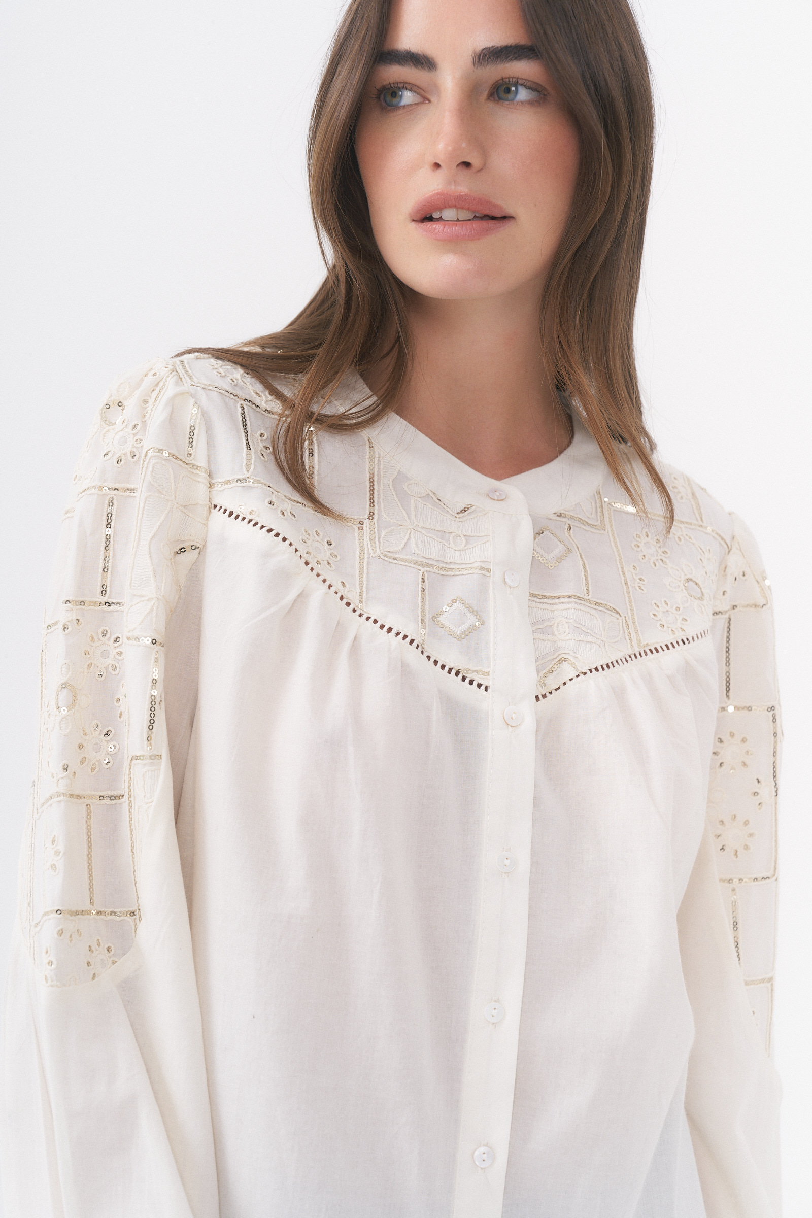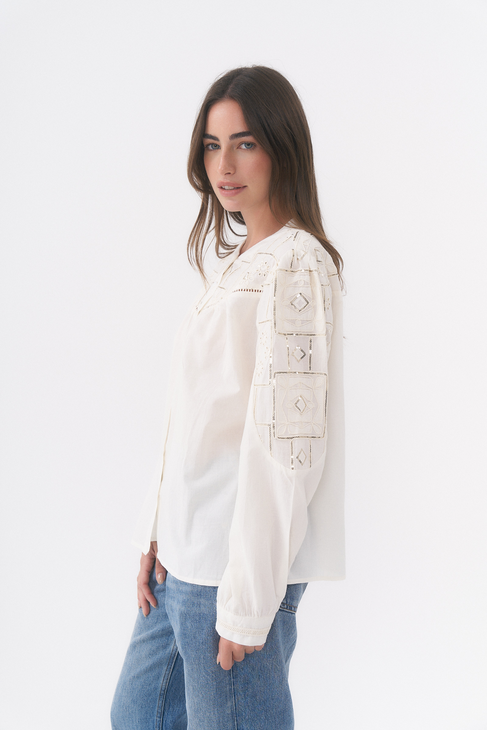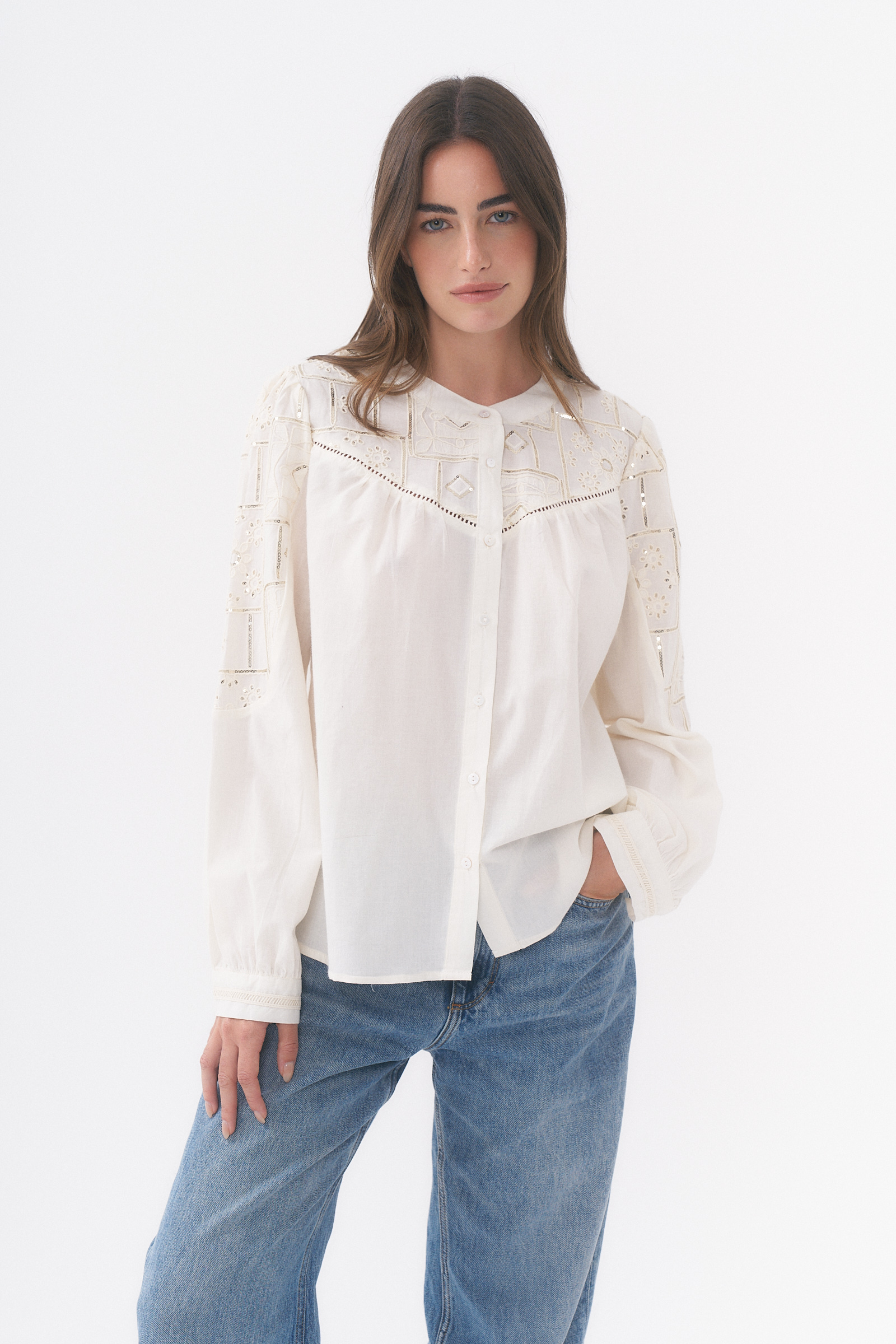 CAMISA MANGA LARGA CON DETALLE DE BORDADO Y LENTEJUELAS / TALLES M Y L