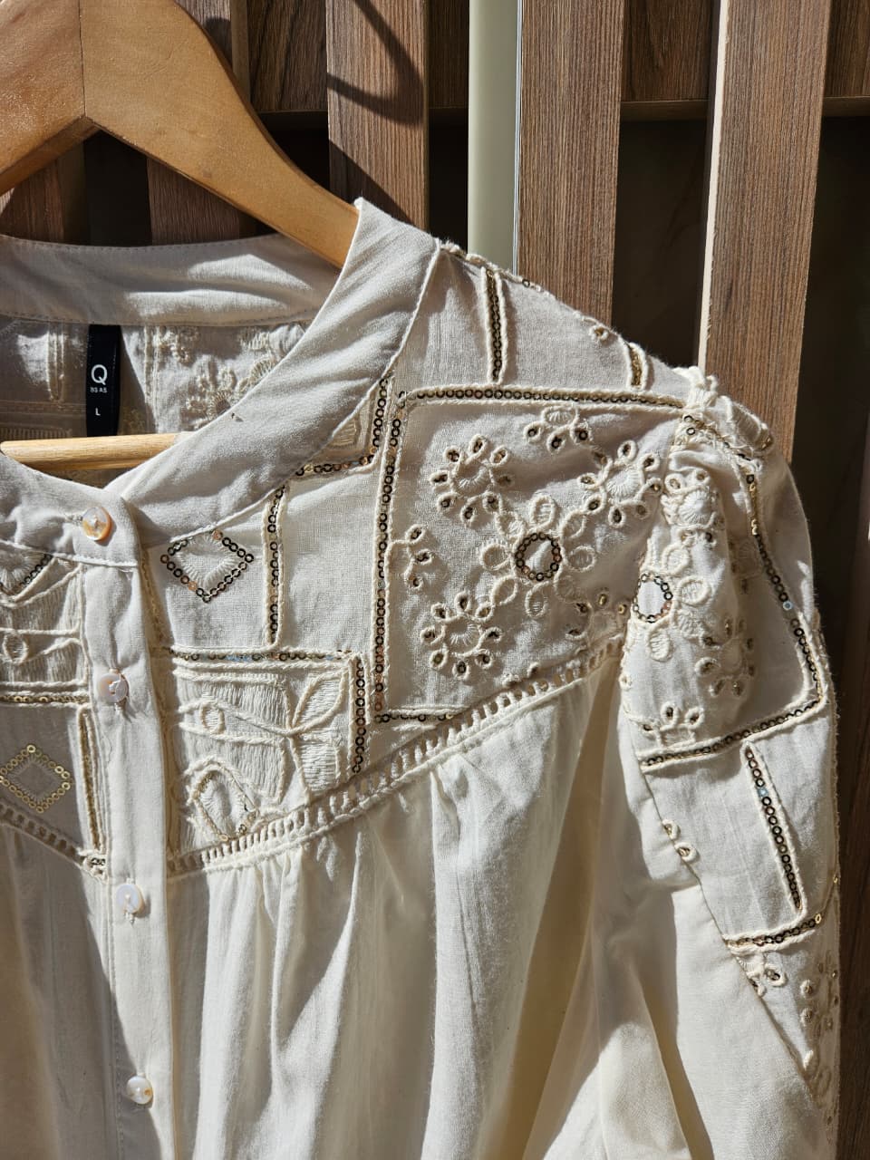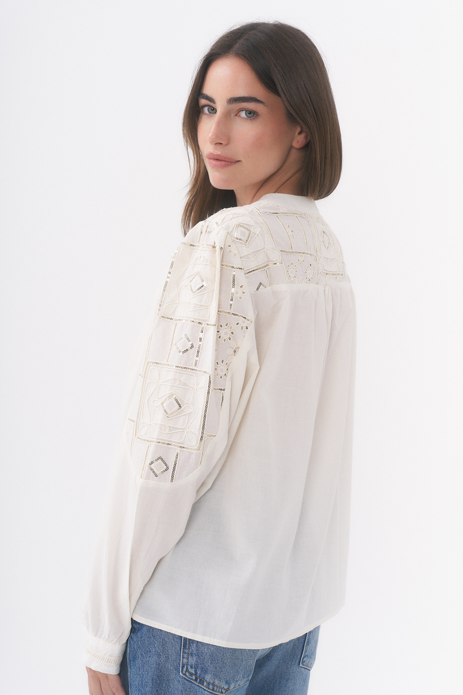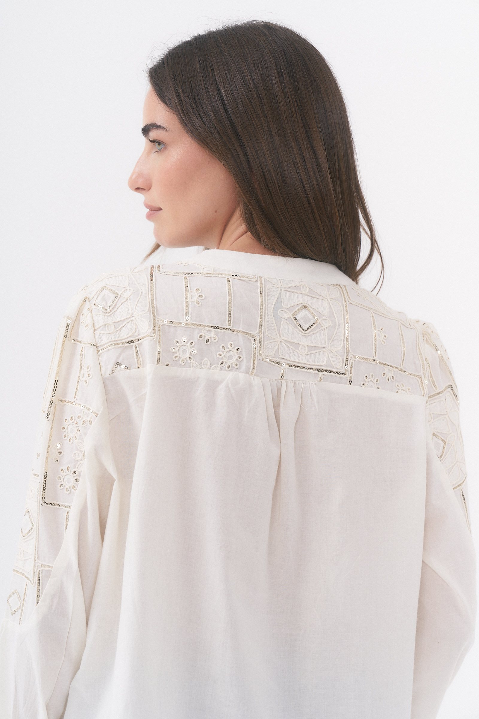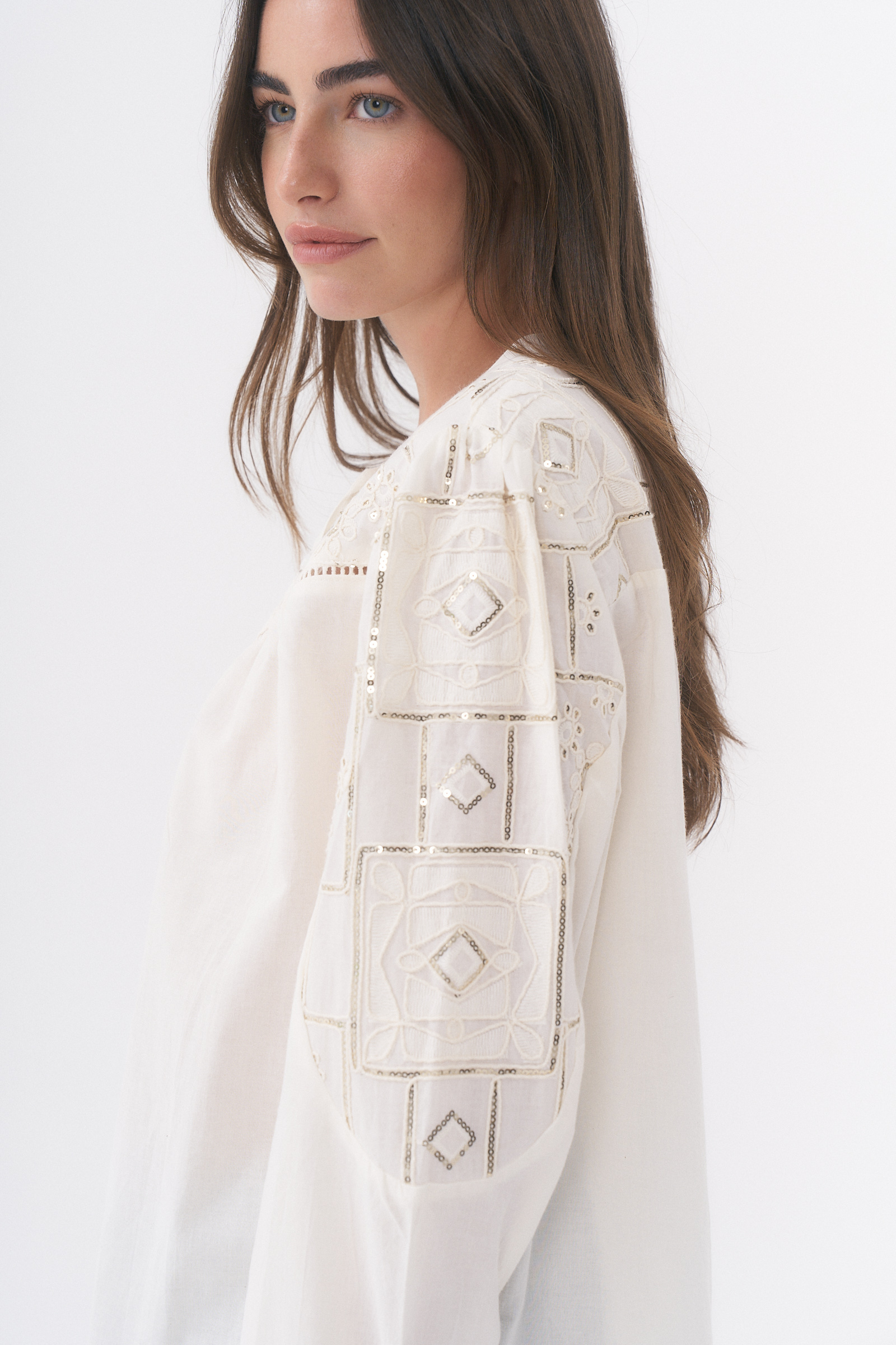 CAMISA MANGA LARGA CON DETALLE DE BORDADO Y LENTEJUELAS / TALLES M Y L