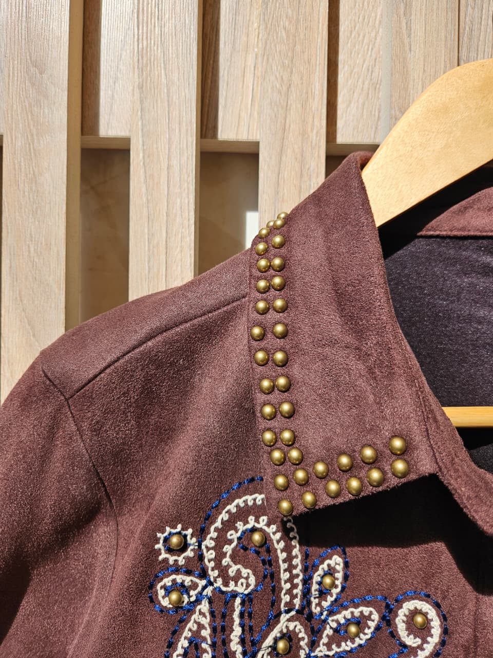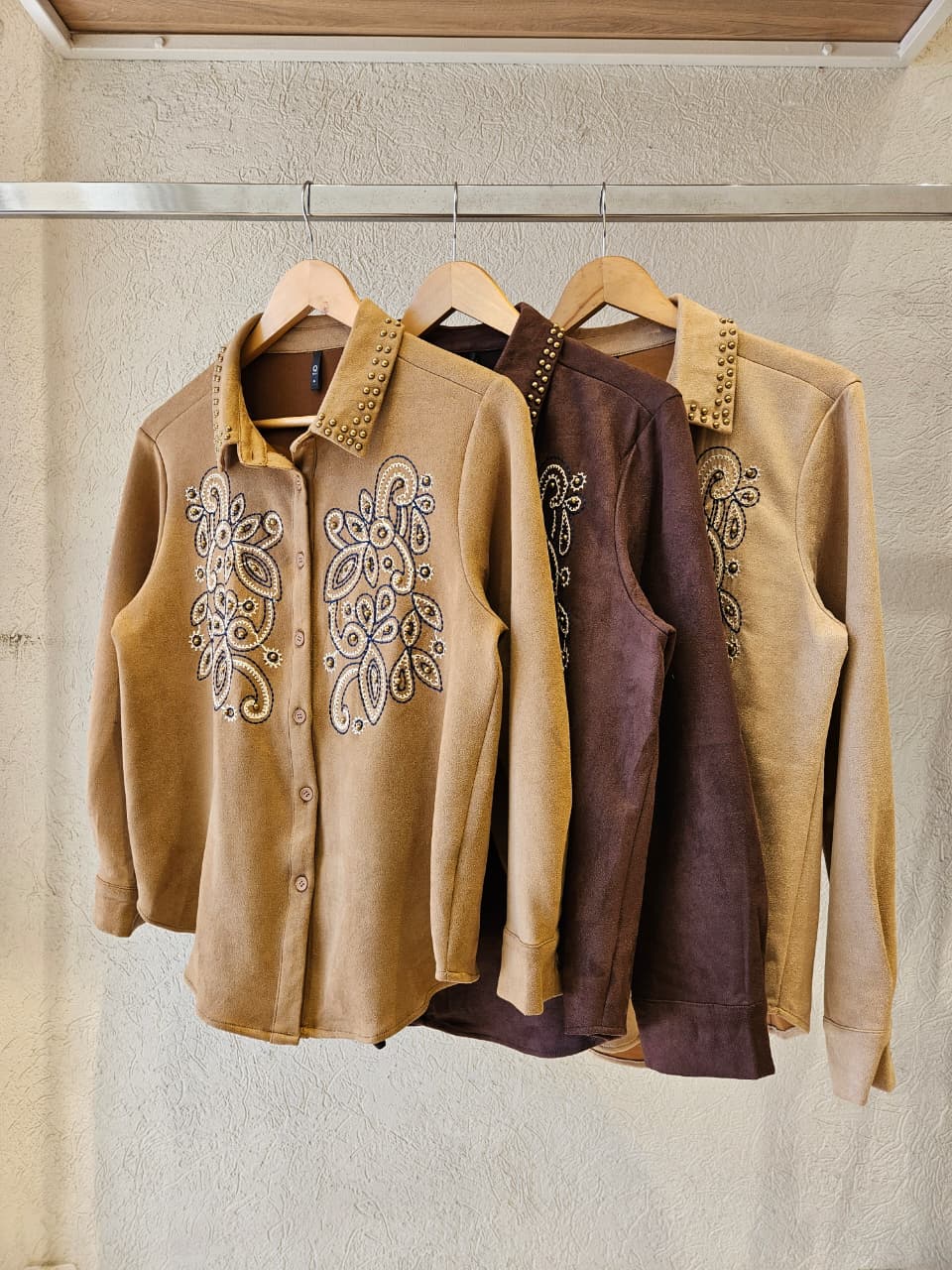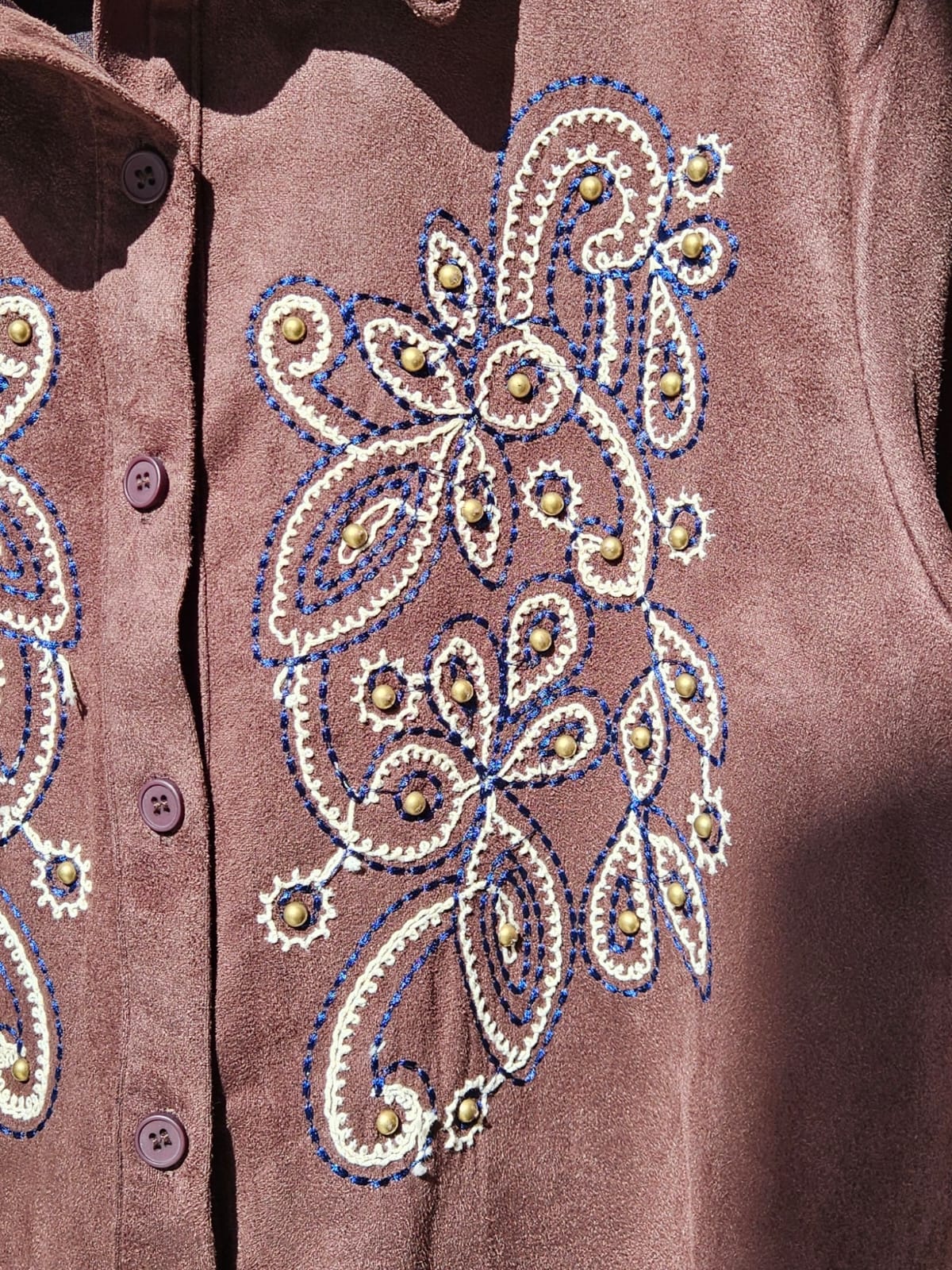 Camisa gamuzada con detalle de tachas doradas y bordado / Talles M y L