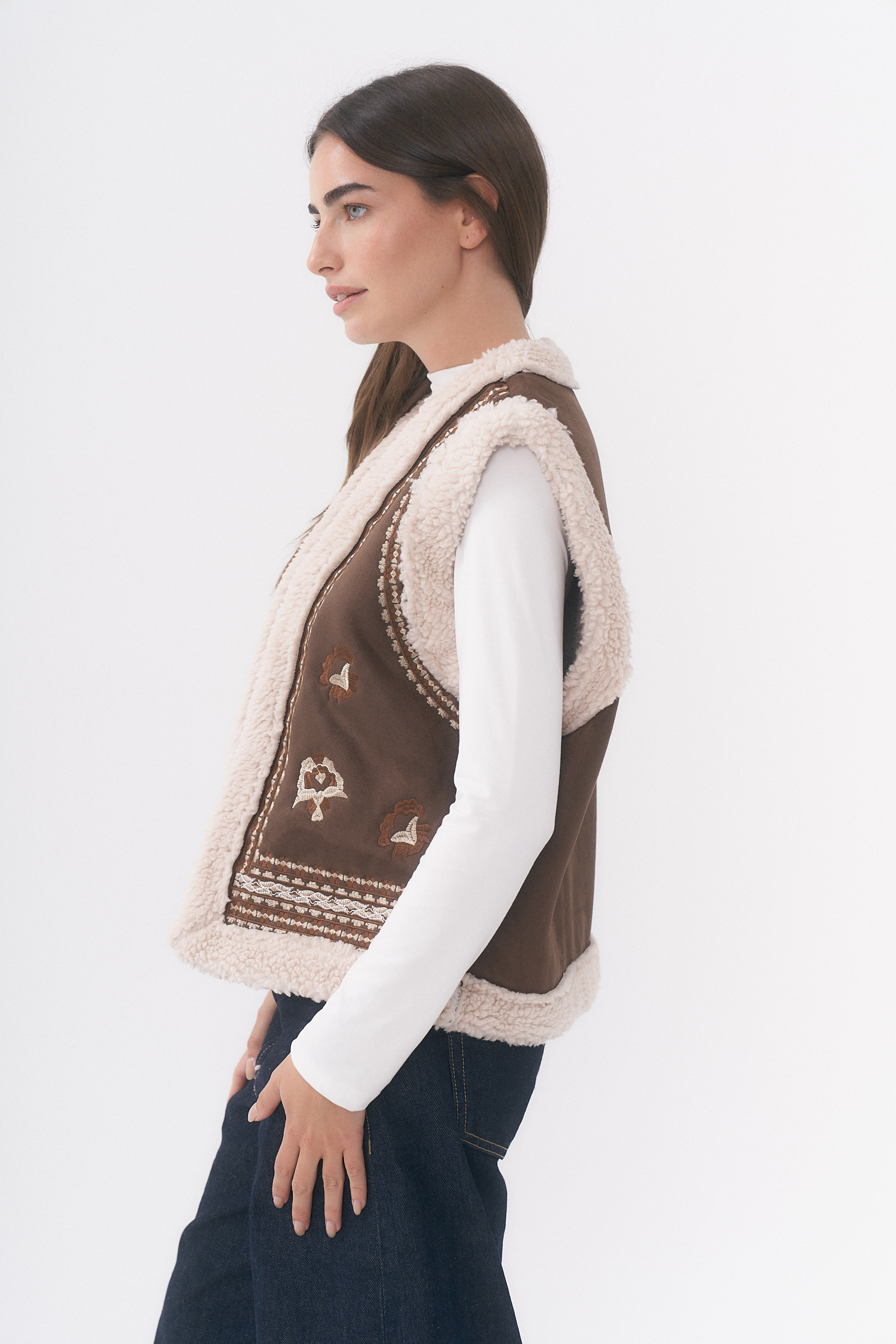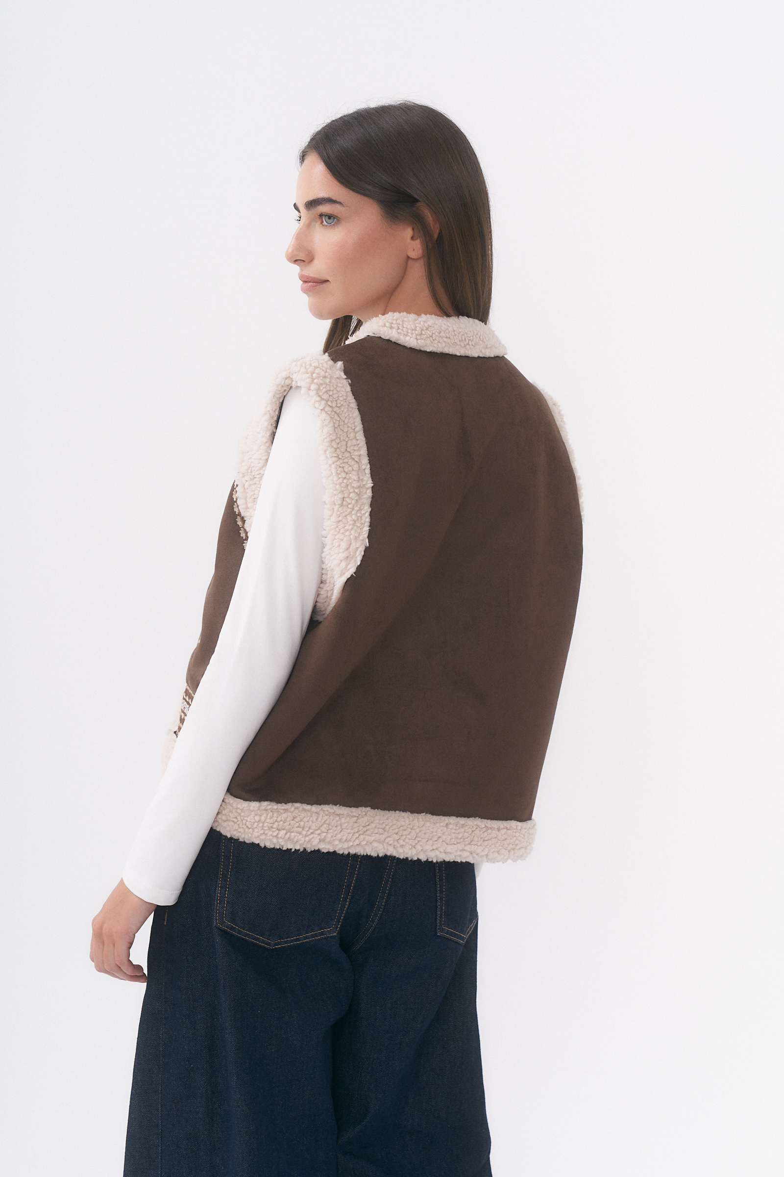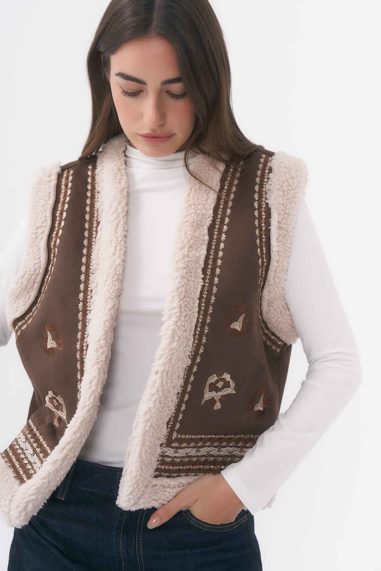 CHALECO DE GAMUZA DETALLE DE BORDADOS EN DELANTEROS Y CON CORDERITO /TALLE M Y L