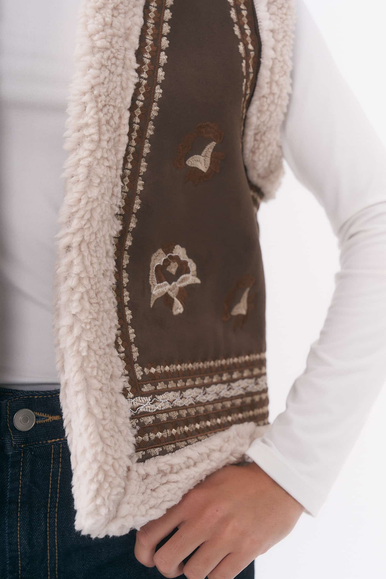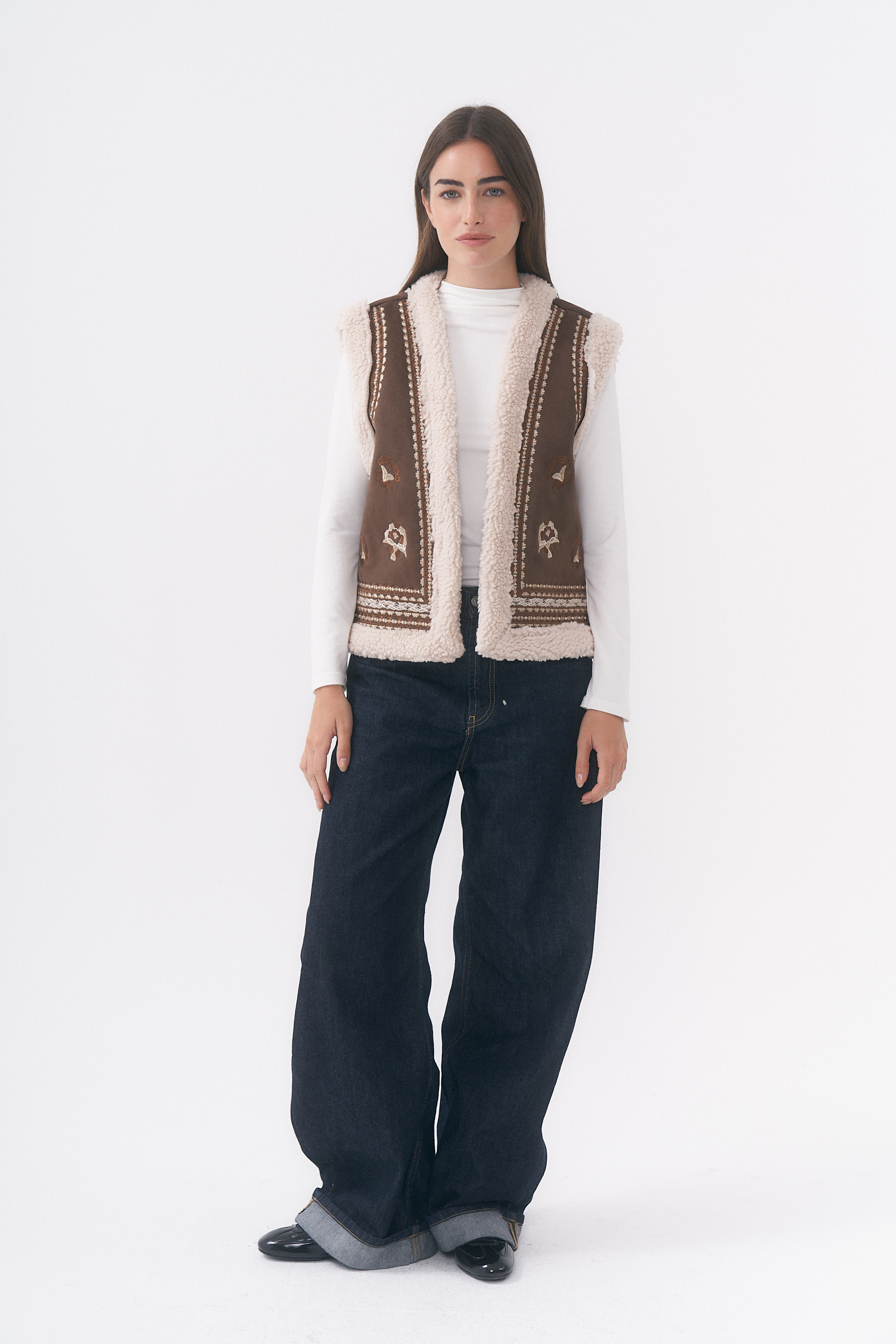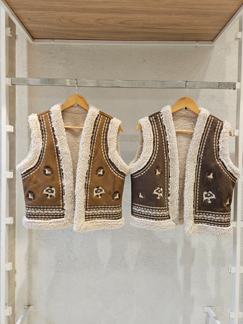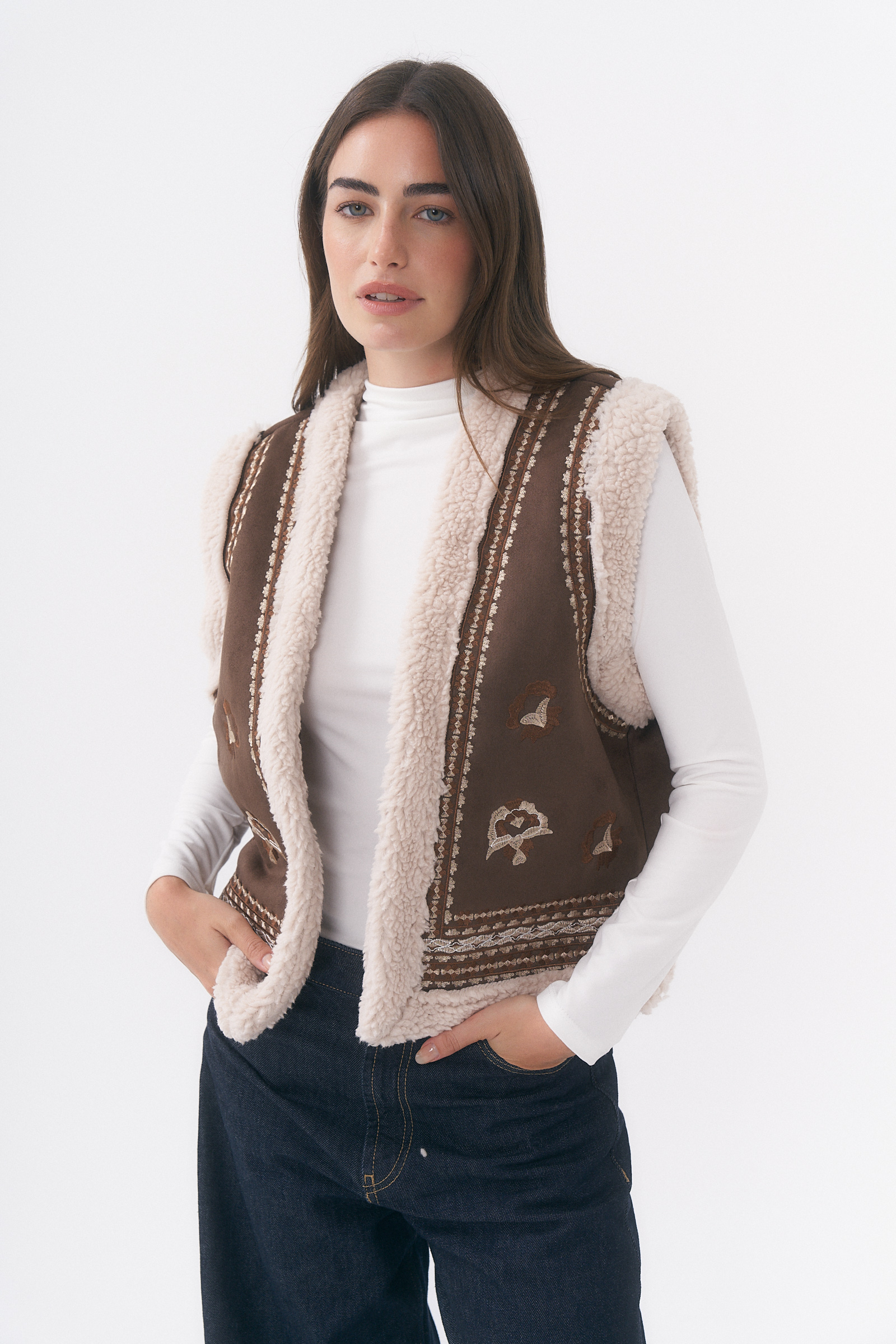 CHALECO DE GAMUZA DETALLE DE BORDADOS EN DELANTEROS Y CON CORDERITO /TALLE M Y L