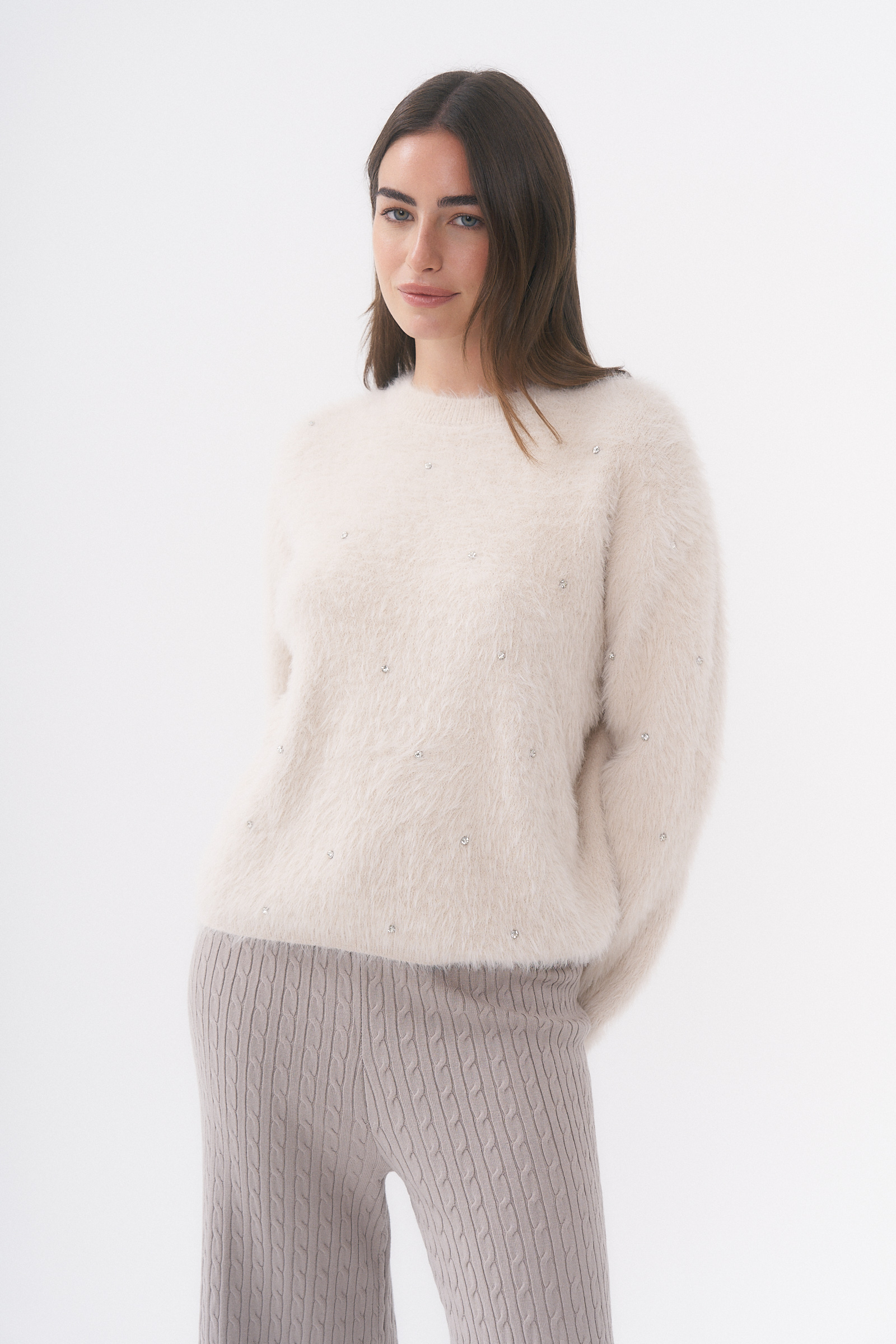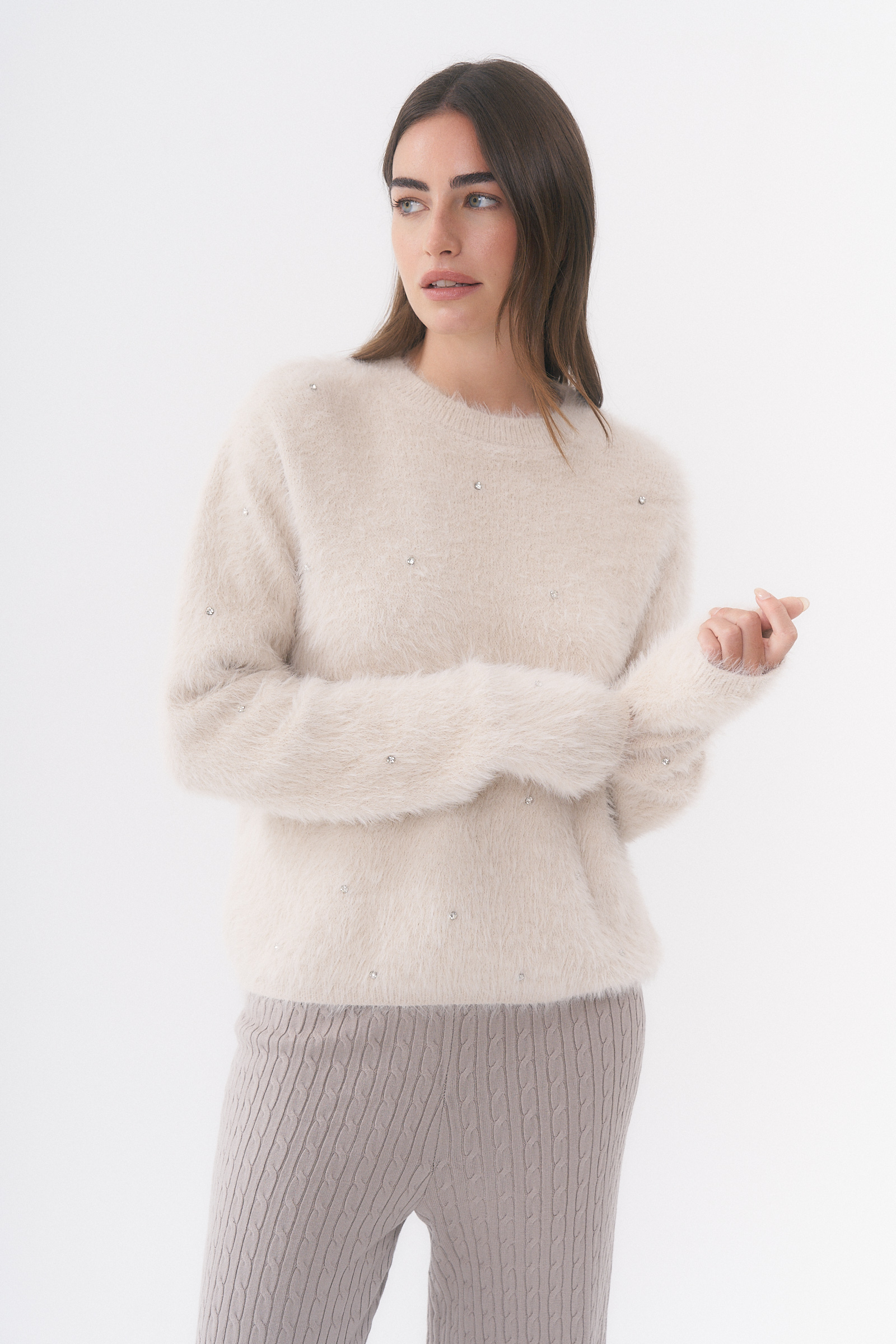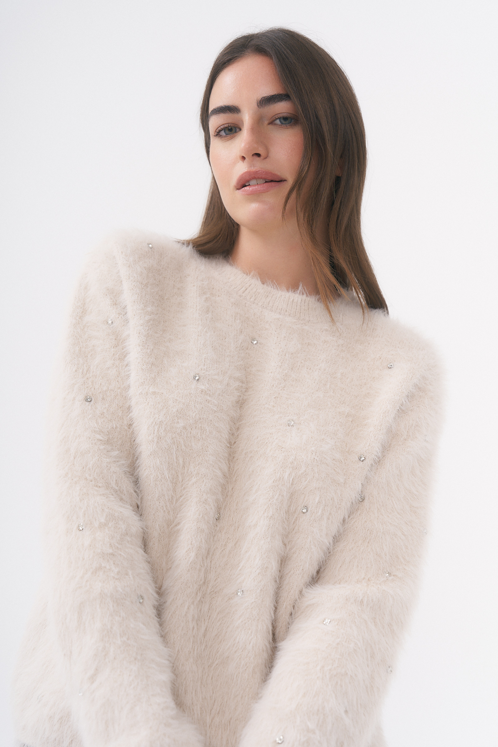 SWEATER DE PUNTO CON TEXTURA DE PELAJE SUAVE Y DETALLE DE STRASS SALPICADO / TALLE ÚNICO