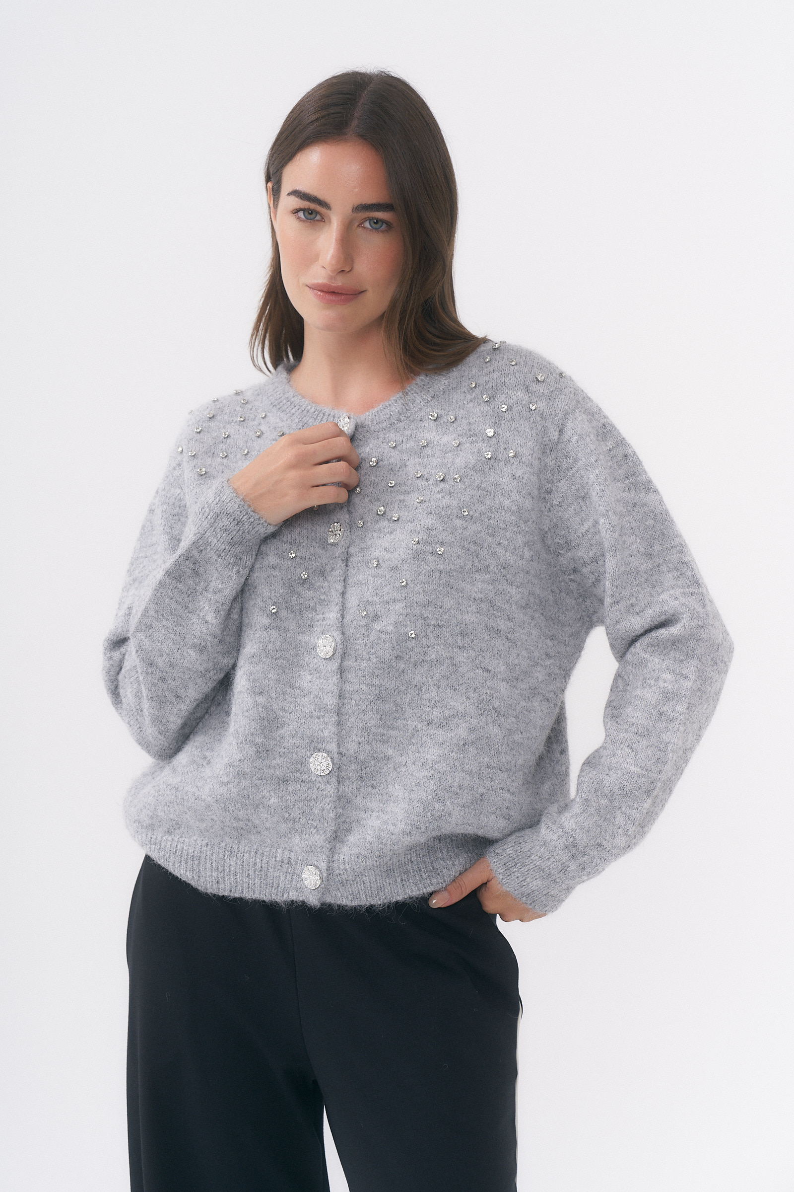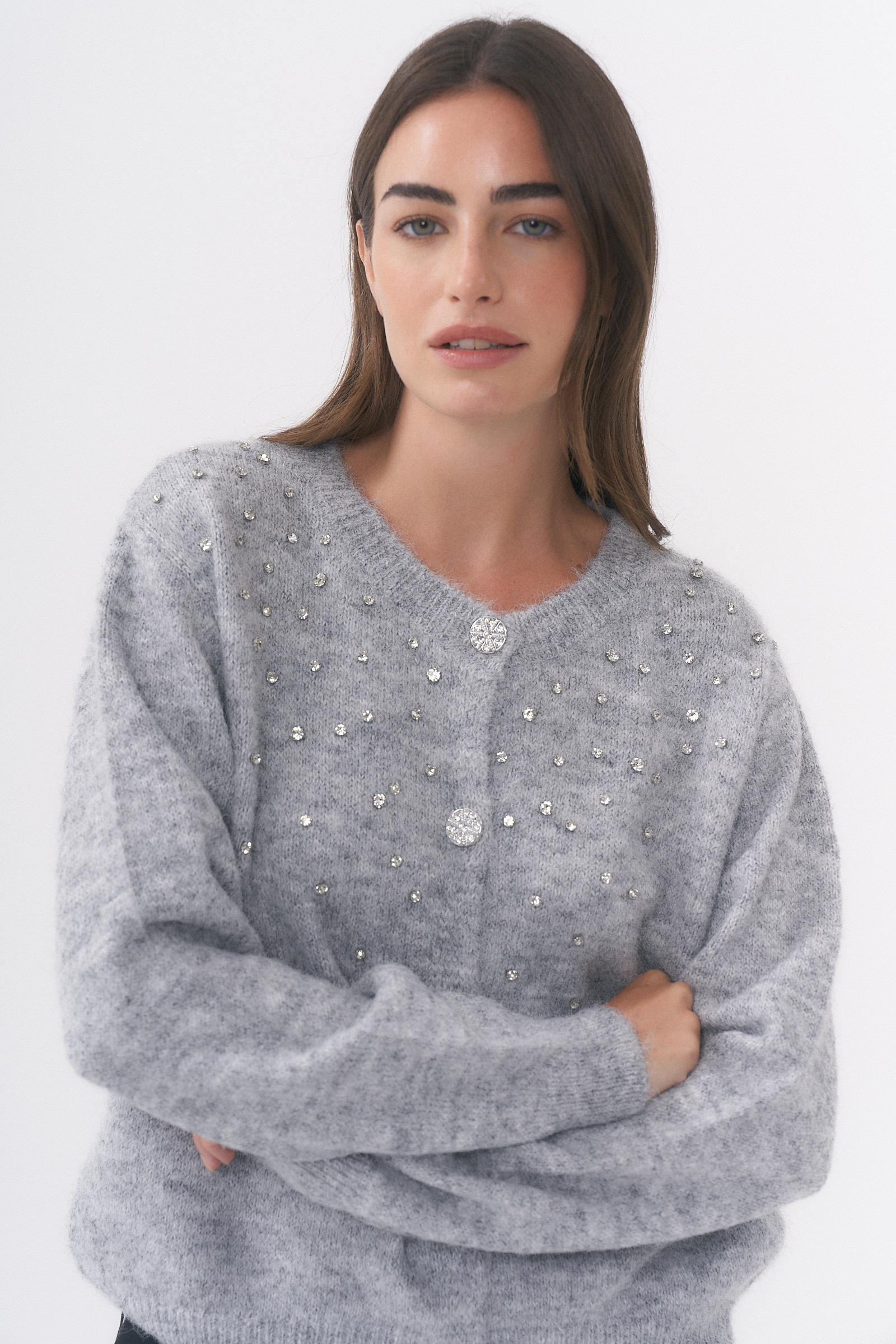 SACO DE PUNTO ABIERTO CON DETALLE DE TACHAS DE STRASS SALPICADO Y BOTONES METÁLICOS CON BRILLOS TRABAJADOS / TALLE ÚNICO