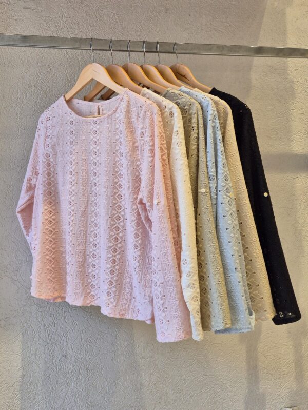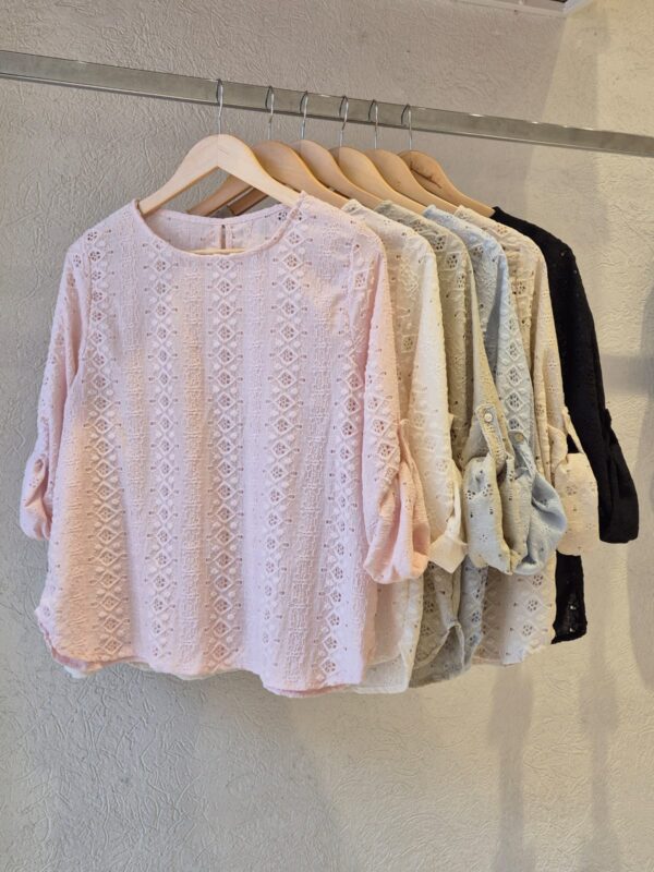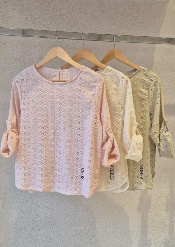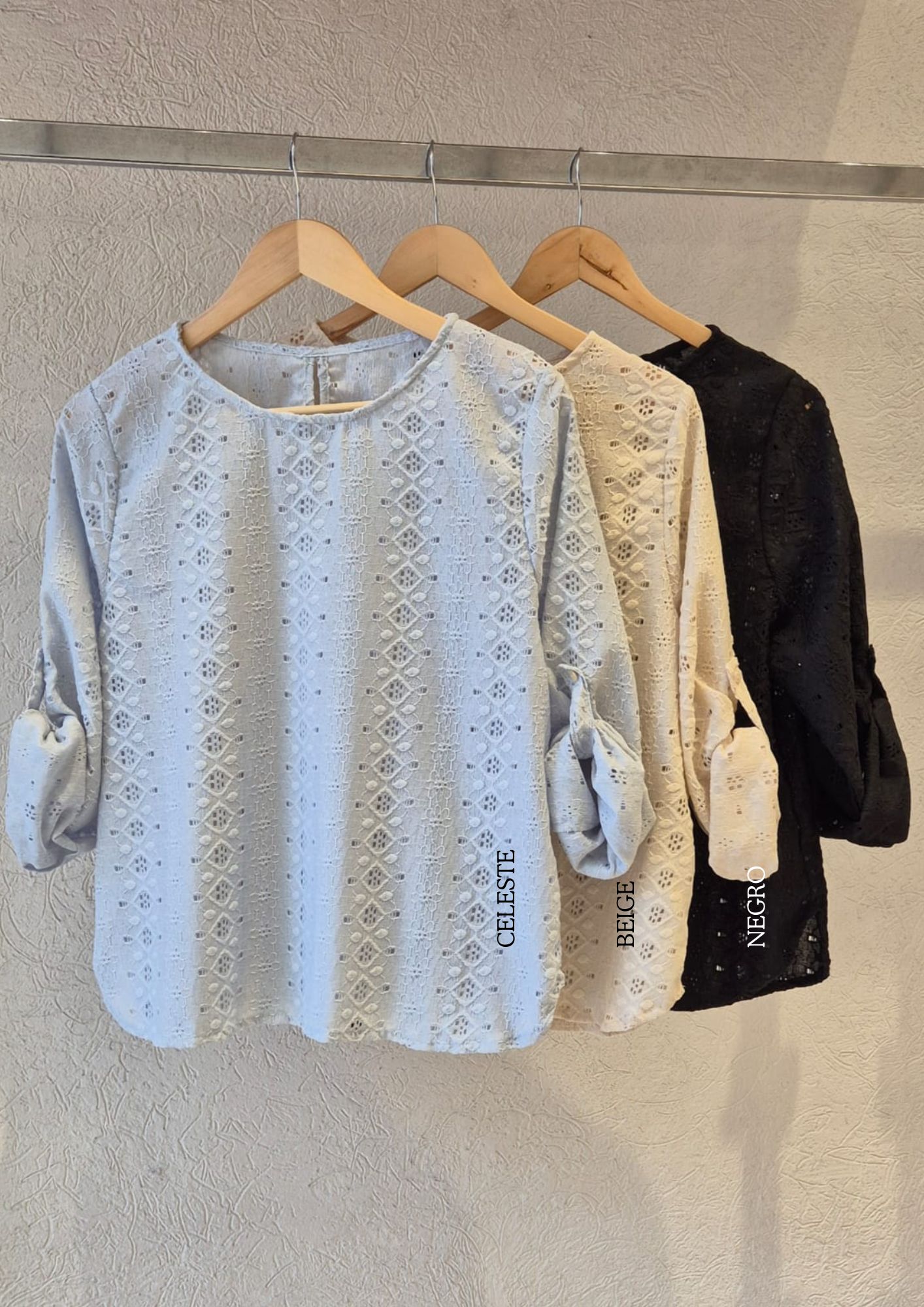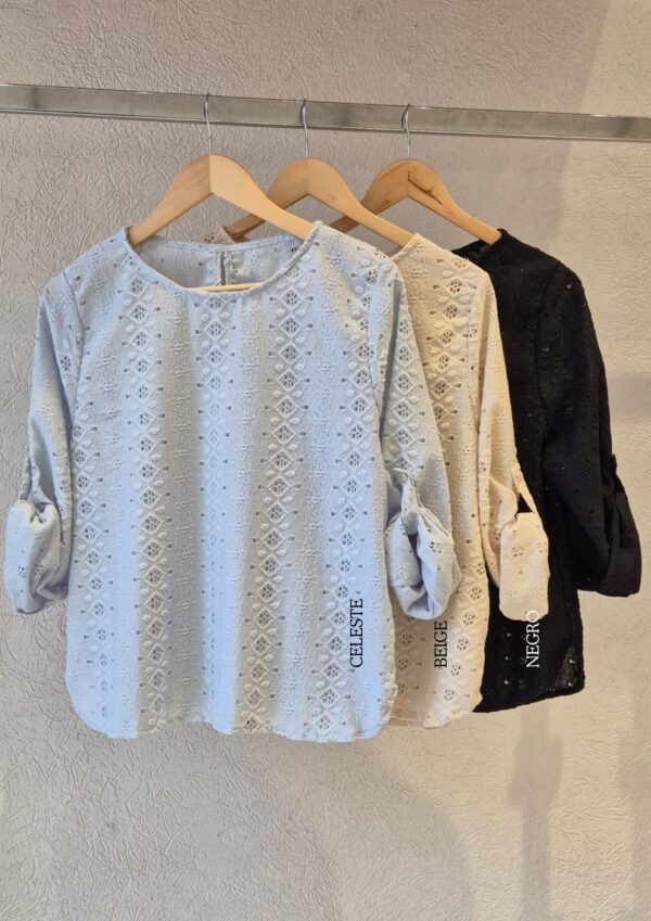 BLUSA DE BRODERIE CUELLO REDONDO MANGAS LARGAS CON TIRAS PARA ARREMANGAR Y DETALLE DE GOTA EN ESPALDA / TALLE UNICO