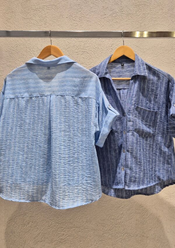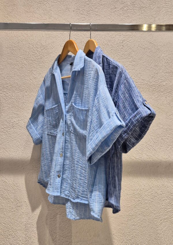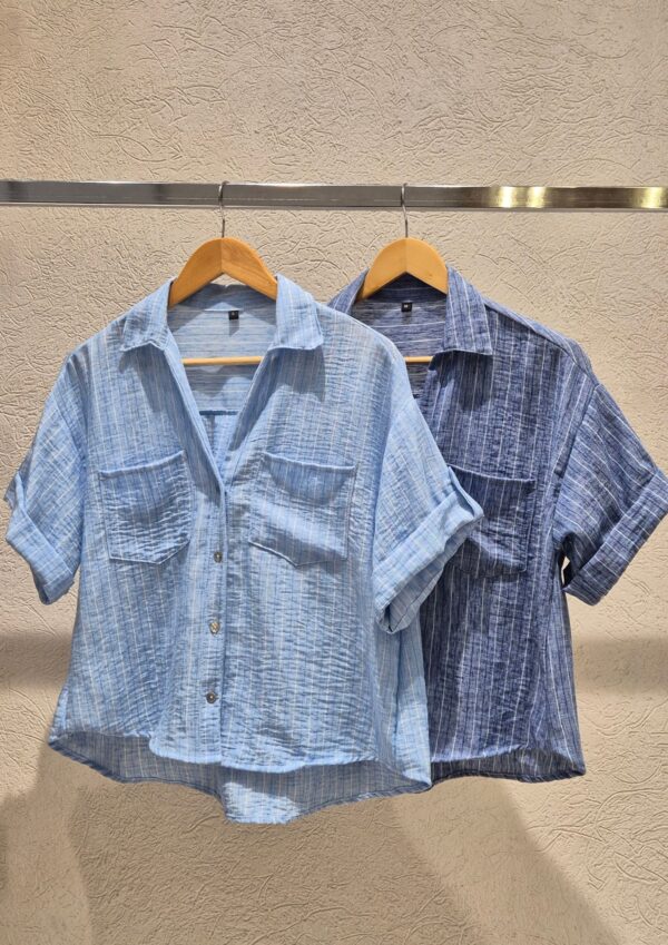 CAMISA GALA MANGAS CORTAS CUELLO V, DETALLE DE TIRAS EN MANGAS Y BOLSILLOS DELANTEROS / TALLES M Y L
